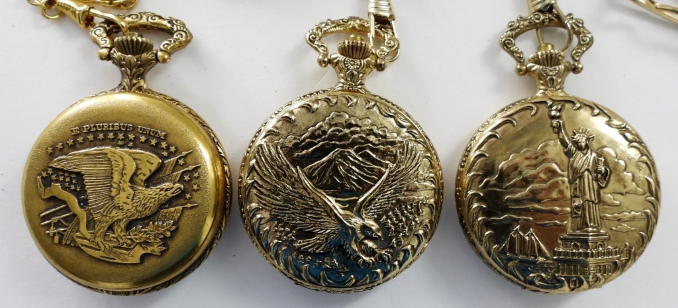 17j LIBERTY BELL STYLE – running NEEDS SERVICED (2) QUARTZ STATUE of LIBERTY STYLE (1) unable to get back snapped on (UNTESTED)