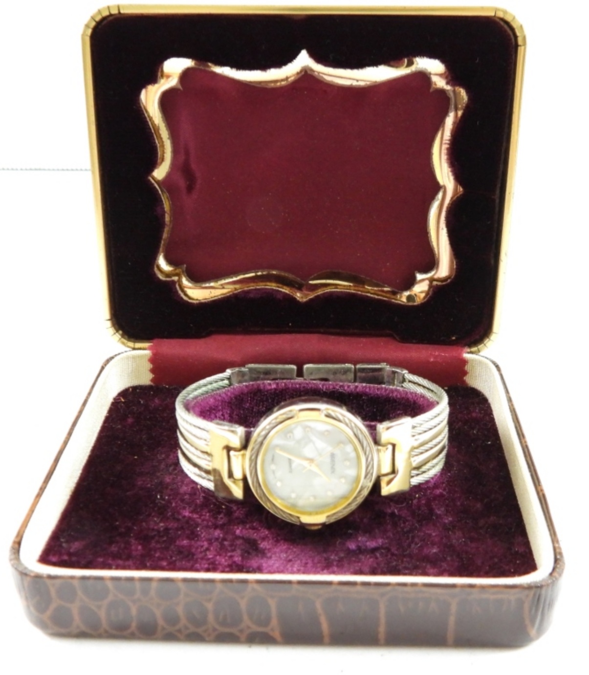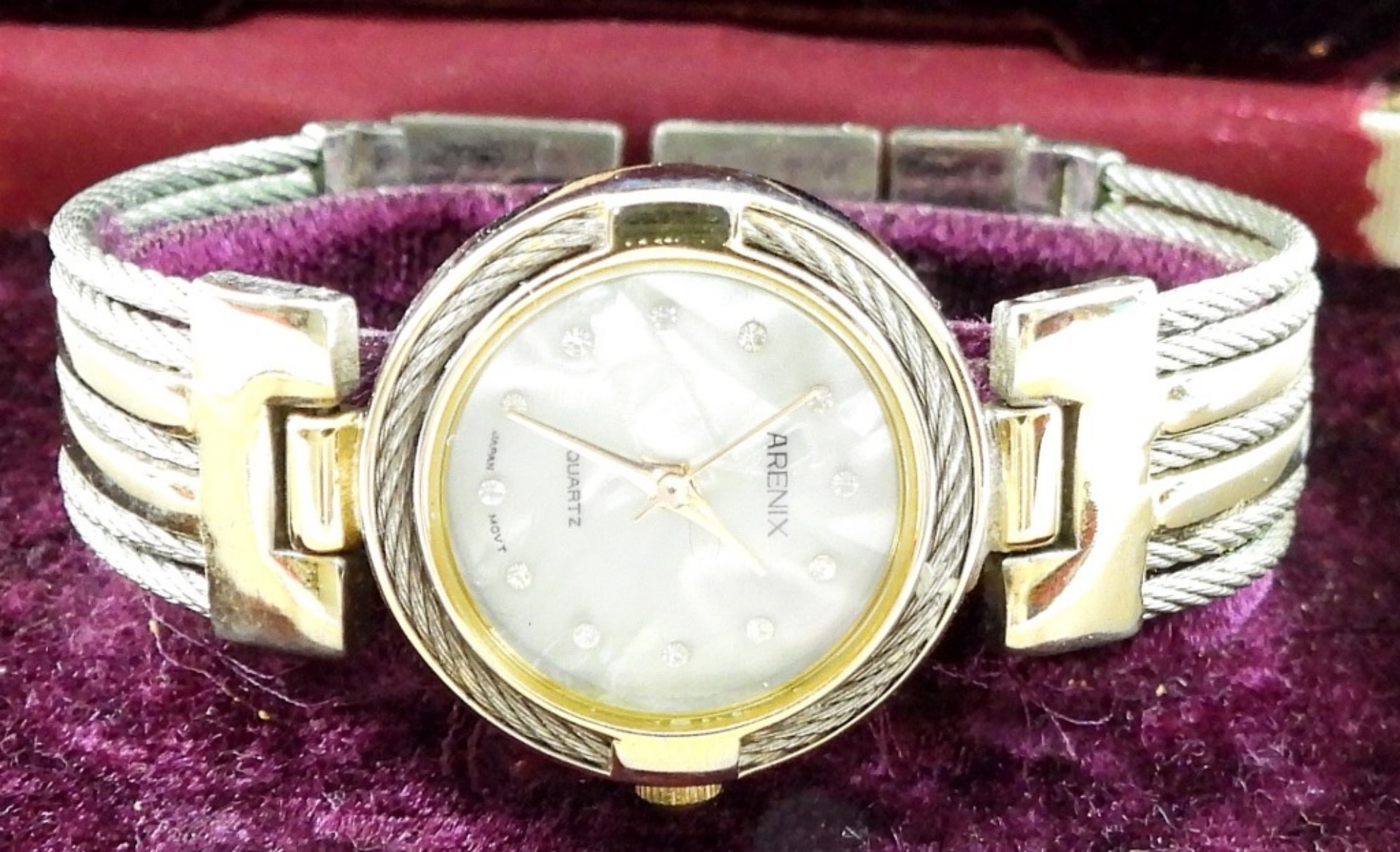 LADIES ARENIX FASHION WATCH, GOLD TONE WITH CLASP BAND.WITH CASE. NOT TESTED AS TO WORKING OR NOT