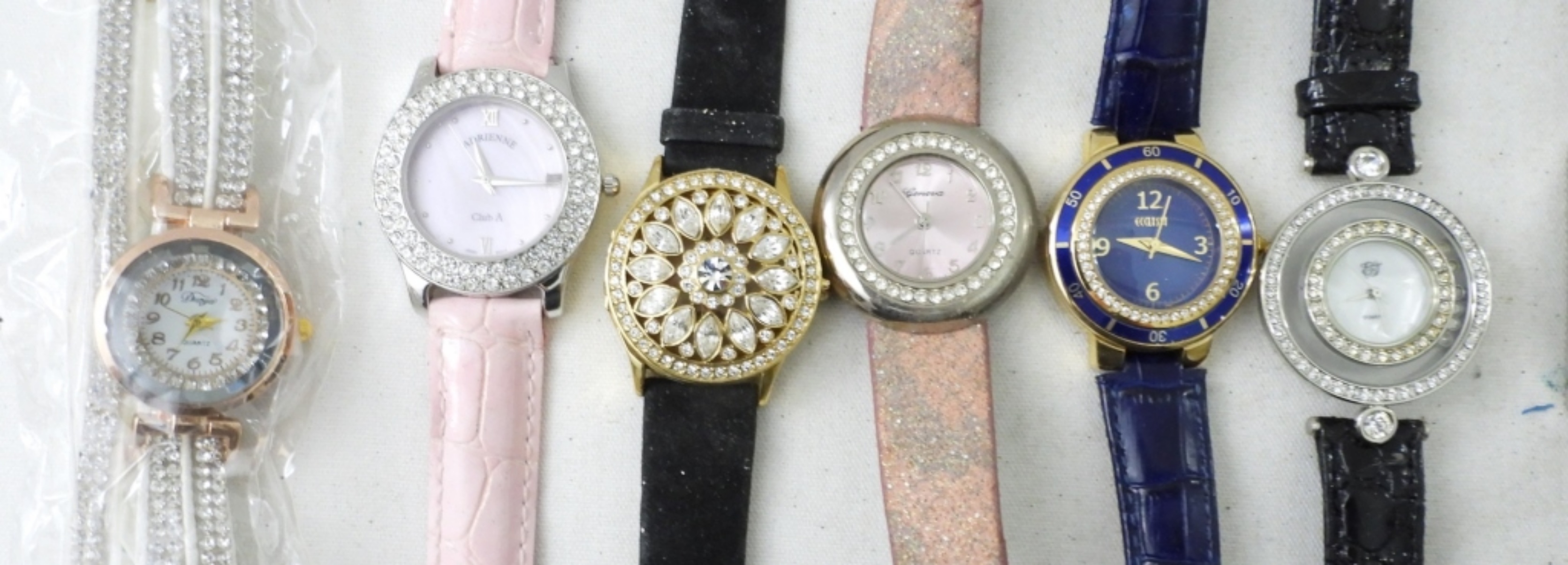 (12) LADIES FASHIONABLE WRIST WATCHES. LEATHER LIKE CLASP BANDS, ASSORTED COLORS AND STYLES . WITH DIAMOND LIKE STONES .NOT TESTED AS TO WORKING OR NOT