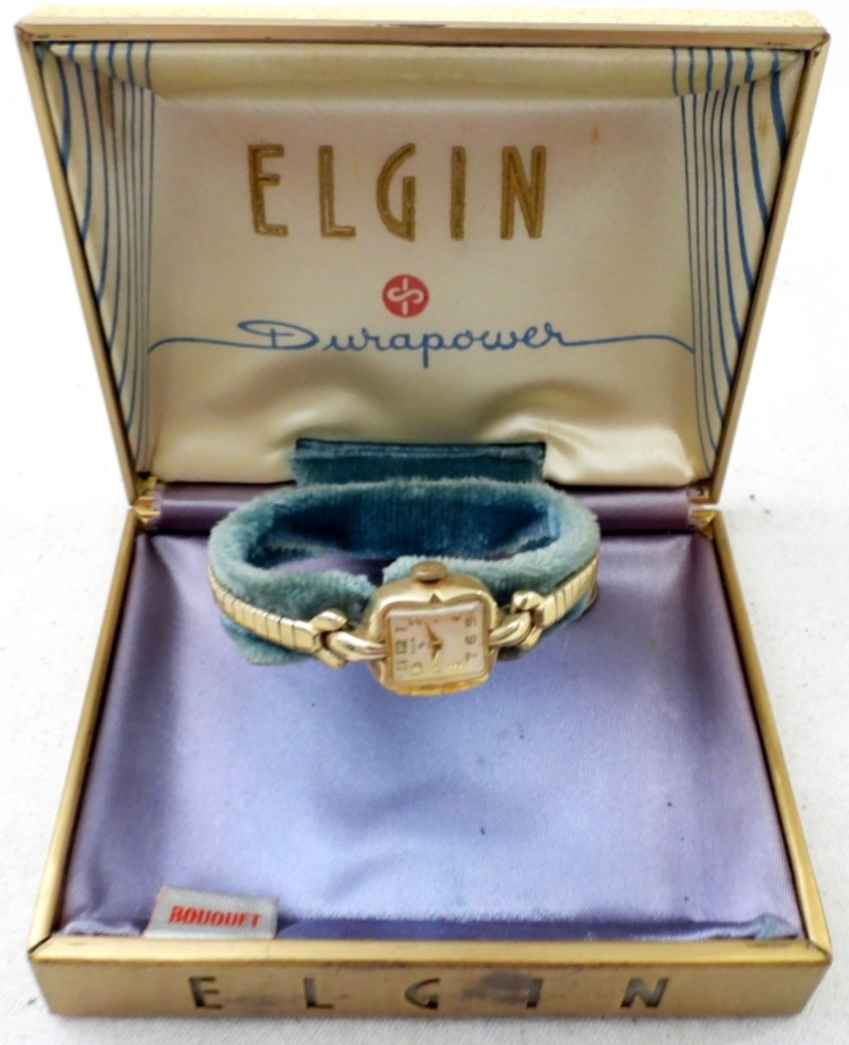 VINTAGE ELGIN DURAPOWER LADIES WRIST WATCH, 10K RGP CLASP BAND LADIES WATCH IN ORIGINAL HARD CASE WITH PURCHASE PAPERS. NOT TESTED AS TO WORKING OR NOT