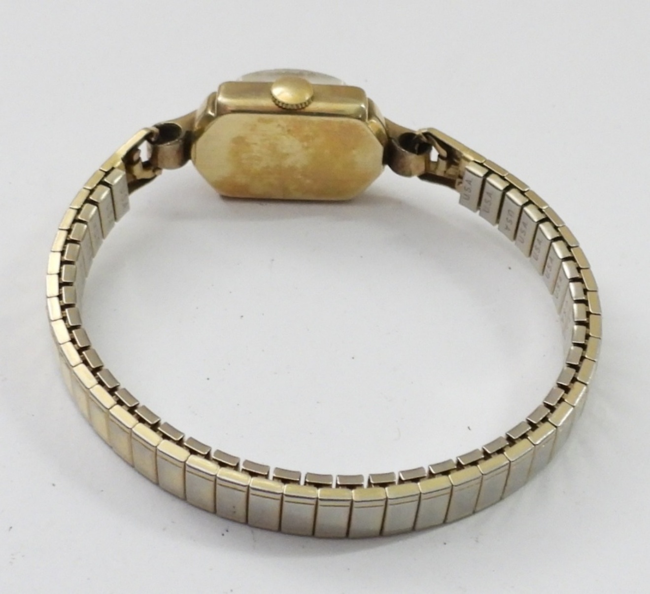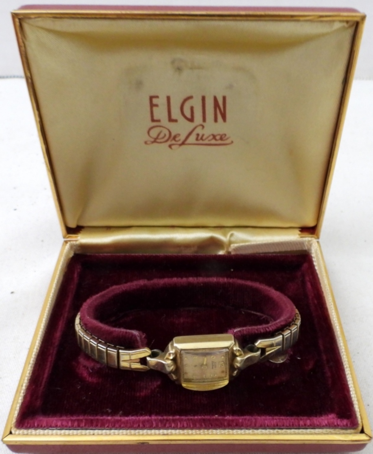 VINTAGE CIRCA 1950 ELGIN LADIES WATCH, GOLD TONE WITH STRETCHY BAND , IN ORIGINAL VELVET CASE AND BOX WITH PAPERS . NOT TESTED AS TO WORKING OR NOT