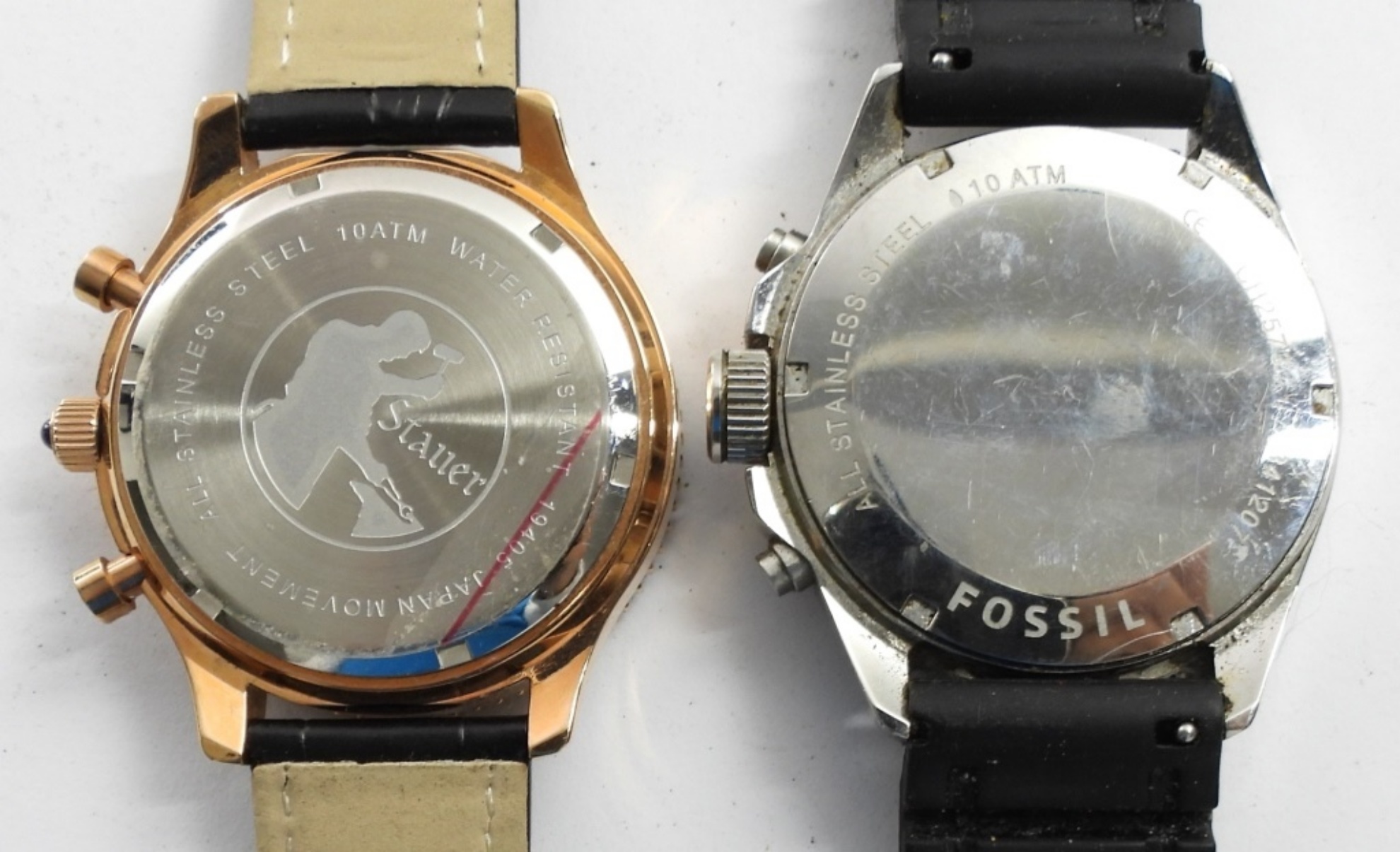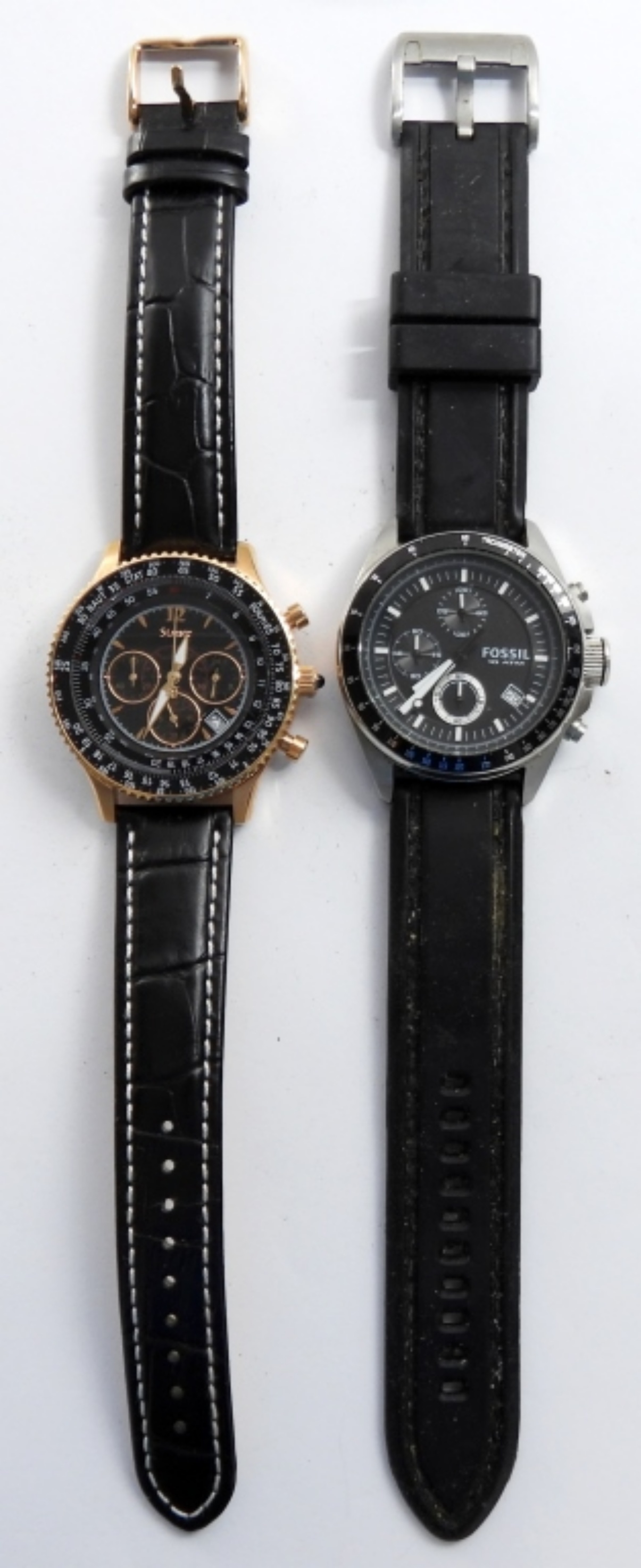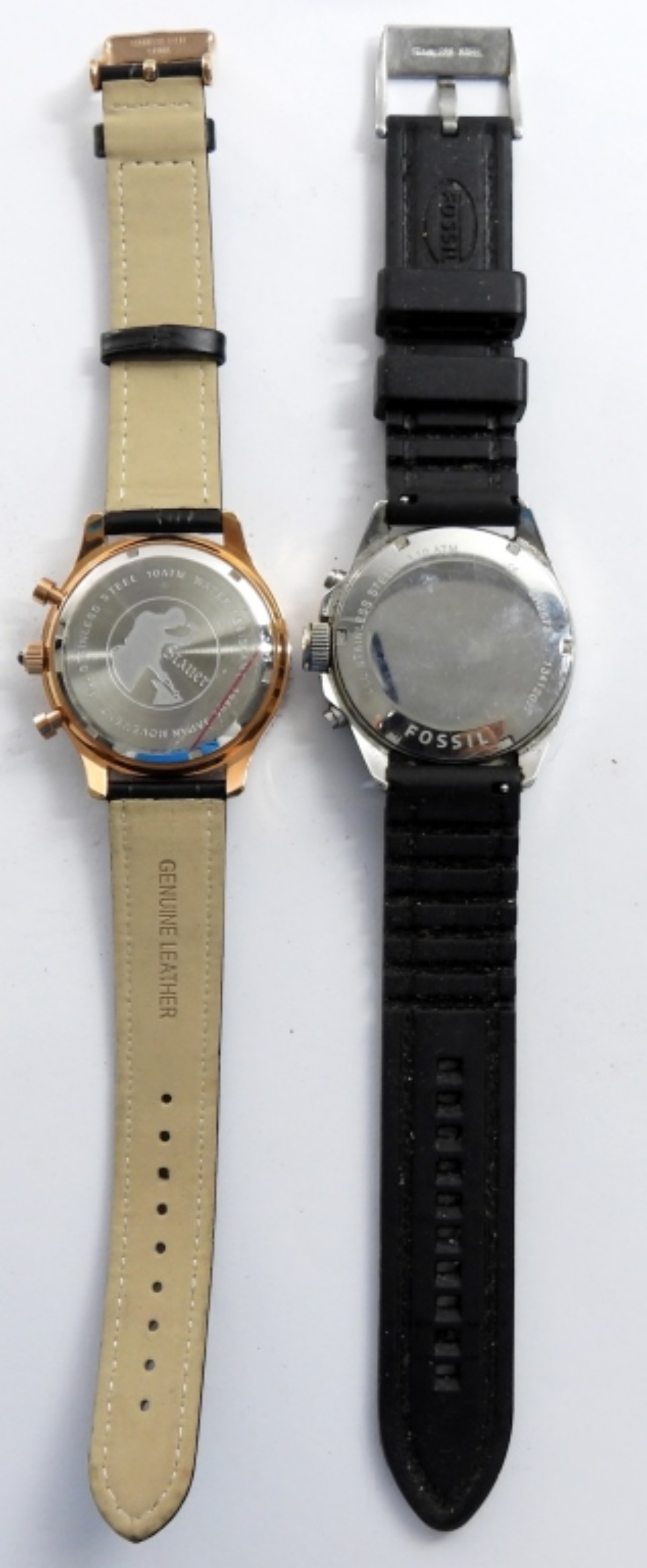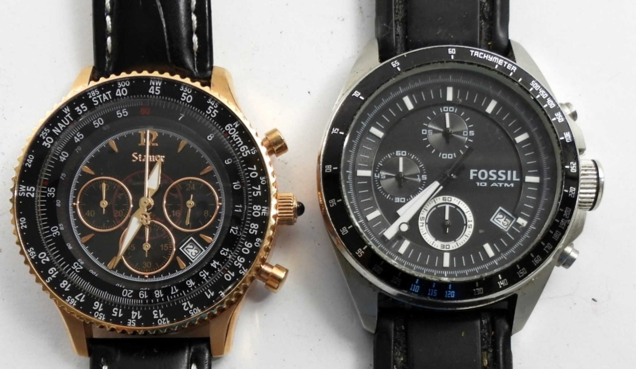 (2 )MEN’S CHRONOGRAPH WATCHES, BOTH WITH BLACK BANDS. FOSSIL & STAUER. 1 GOLD TONE 1 SILVER TONE. ( NOT TESTED AS TO WORKING OR NOT)