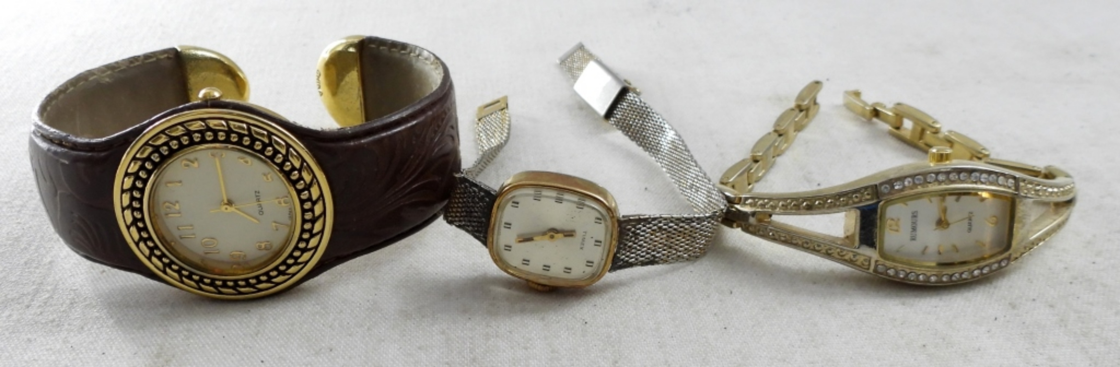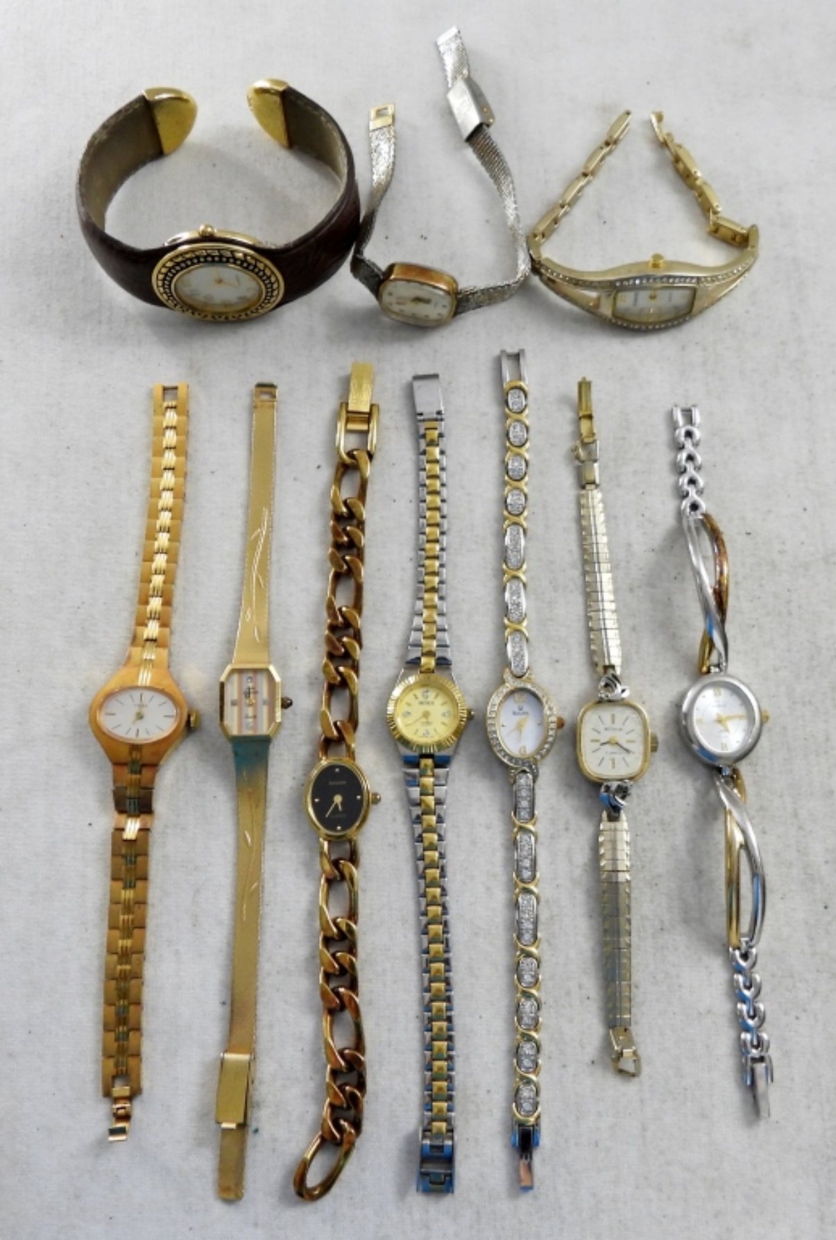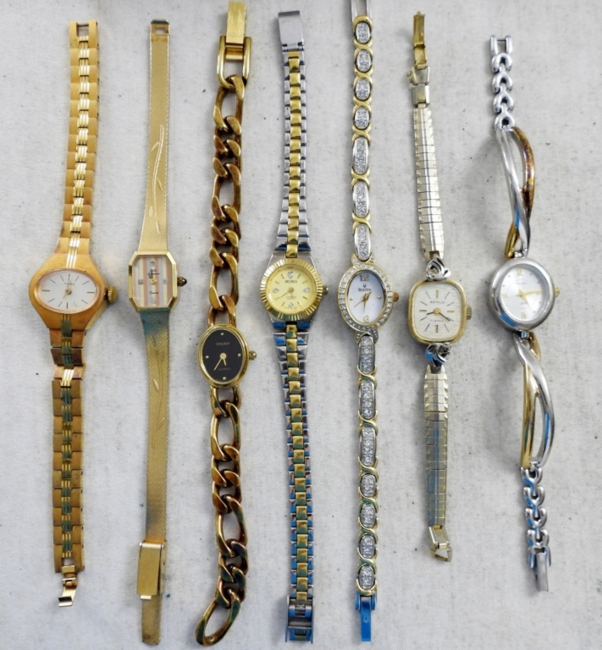NOT TESTED, ALL DIFFERENT STYLES, SOME BRANDS INCLUDE BULOVA, TIMEX, RUMOURS, BENRUS, GRUEN