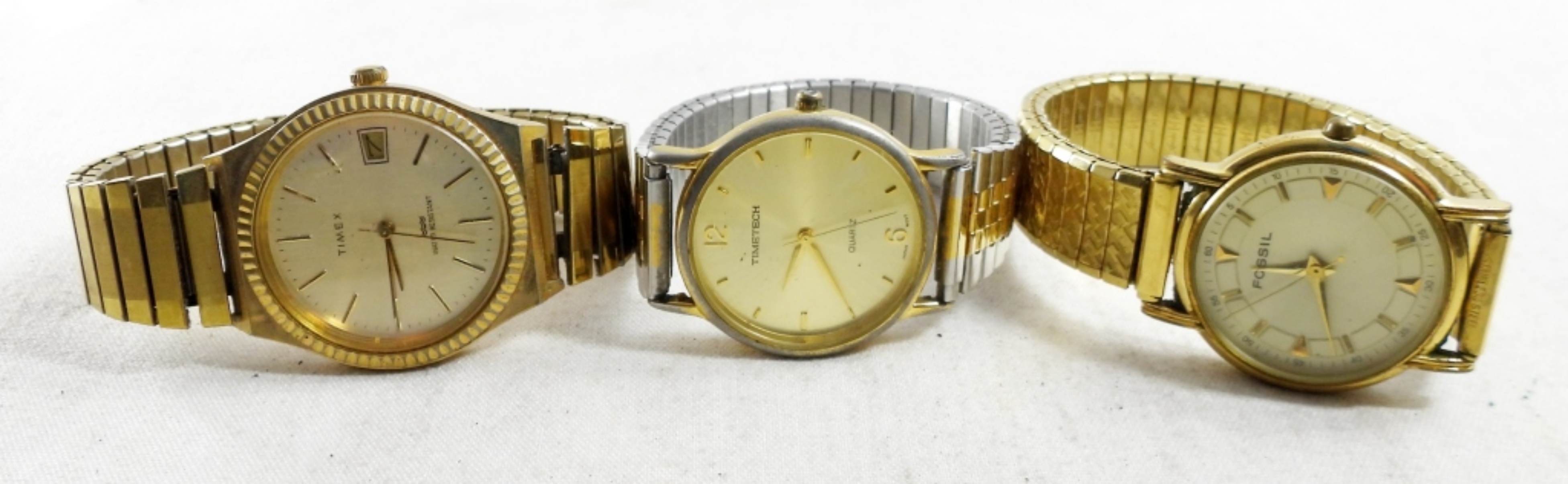 (5) MEN’S GOLD TONE MEN’S WATCHES. ALL WITH STETHCHY BANDS . TIMEX, FOSSIL & MORE( NOT TESTED AS TO WORKING OR NOT)
