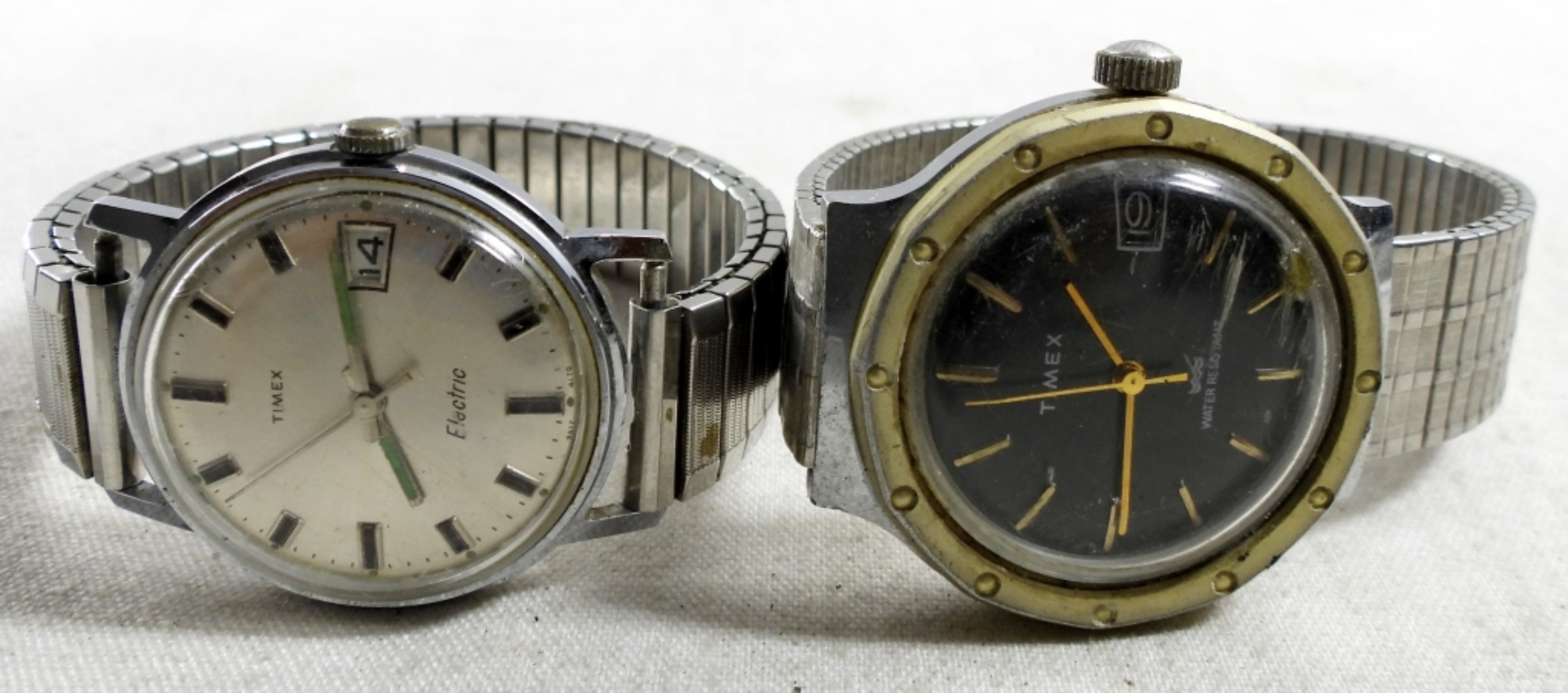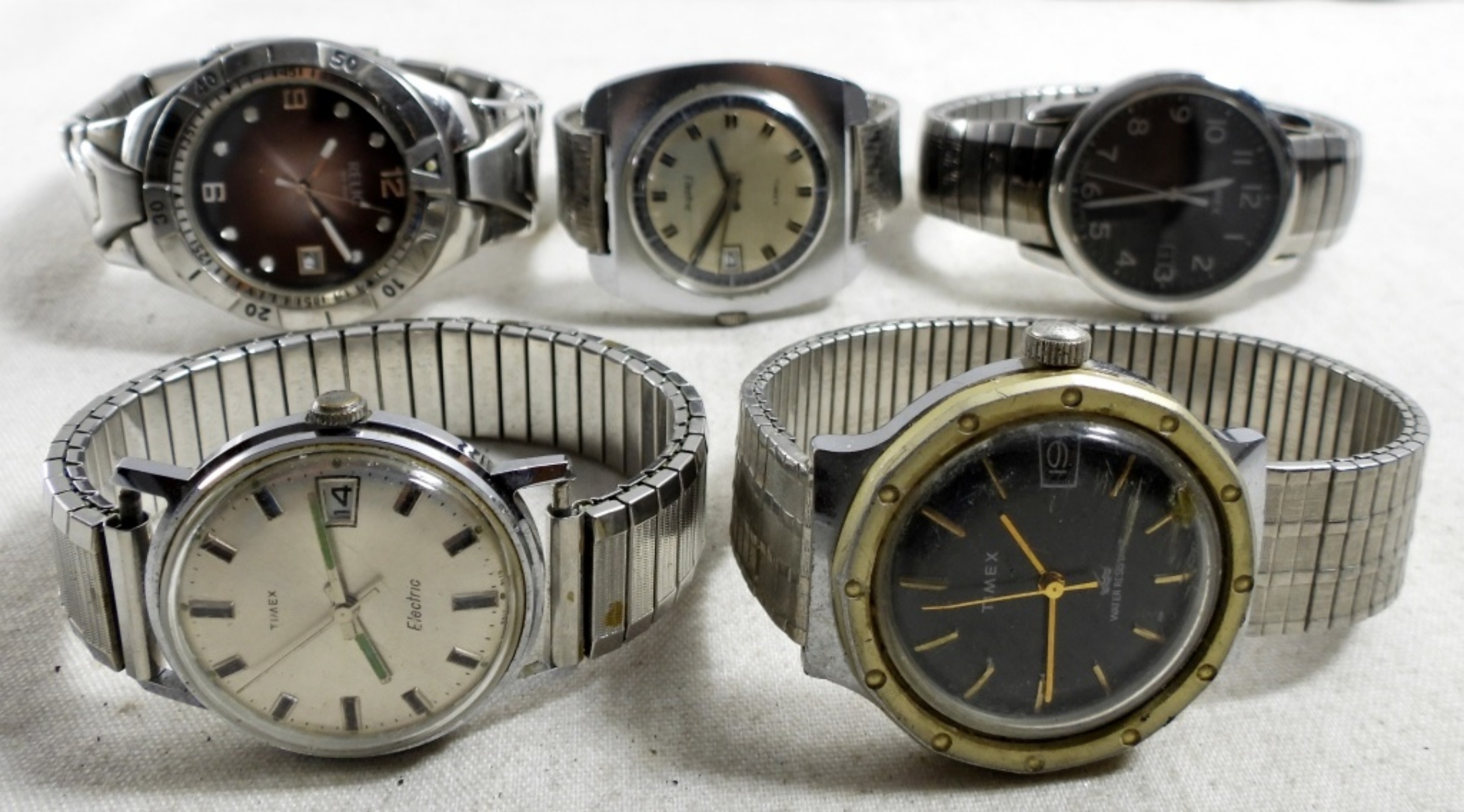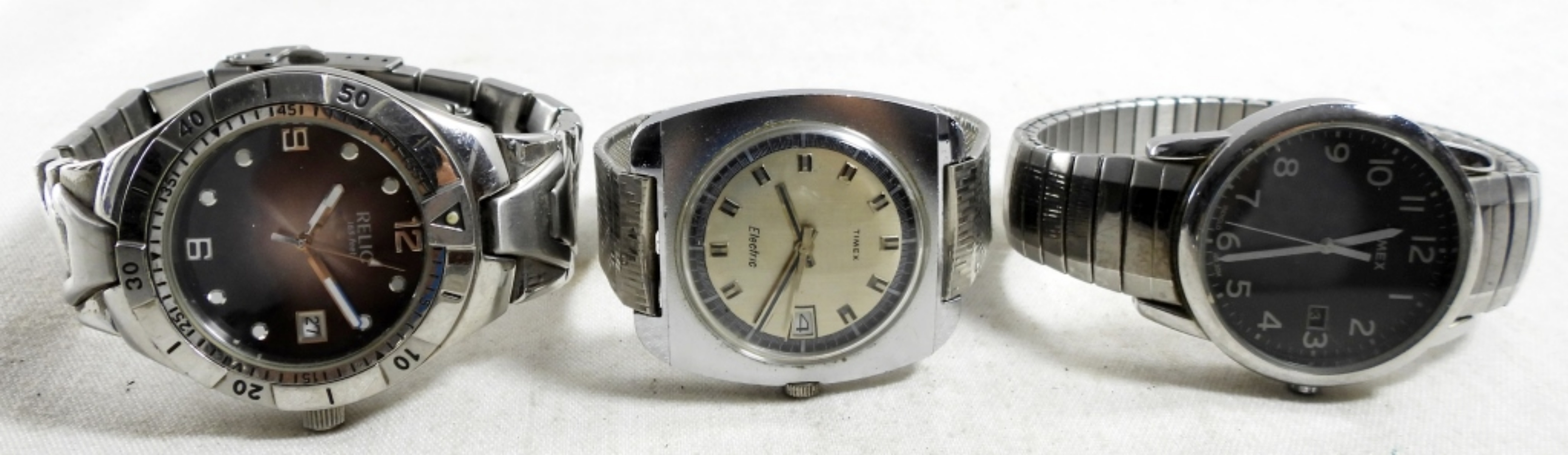 (5) SILVER TONE MENS DATE WATCHES ,ASSORTED BANDS ,RELIC TIMEX & MORE( NOT TESTED AS TO WORKING OR NOT )