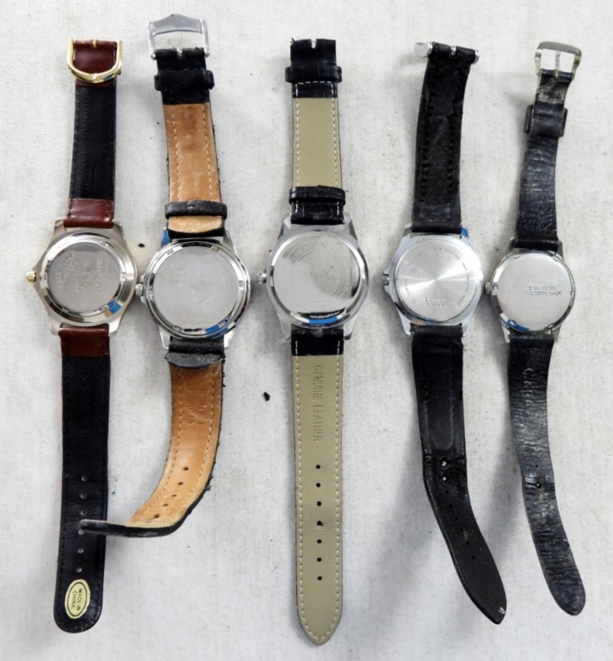 (5) LEATHER BAND MENS DATE WATCHES 4 BLACK LEATHER BANDS AND 1 BROWN BAND.POLO, WENGER & MORE( NOT TESTED AS TO WORKING OR NOT )