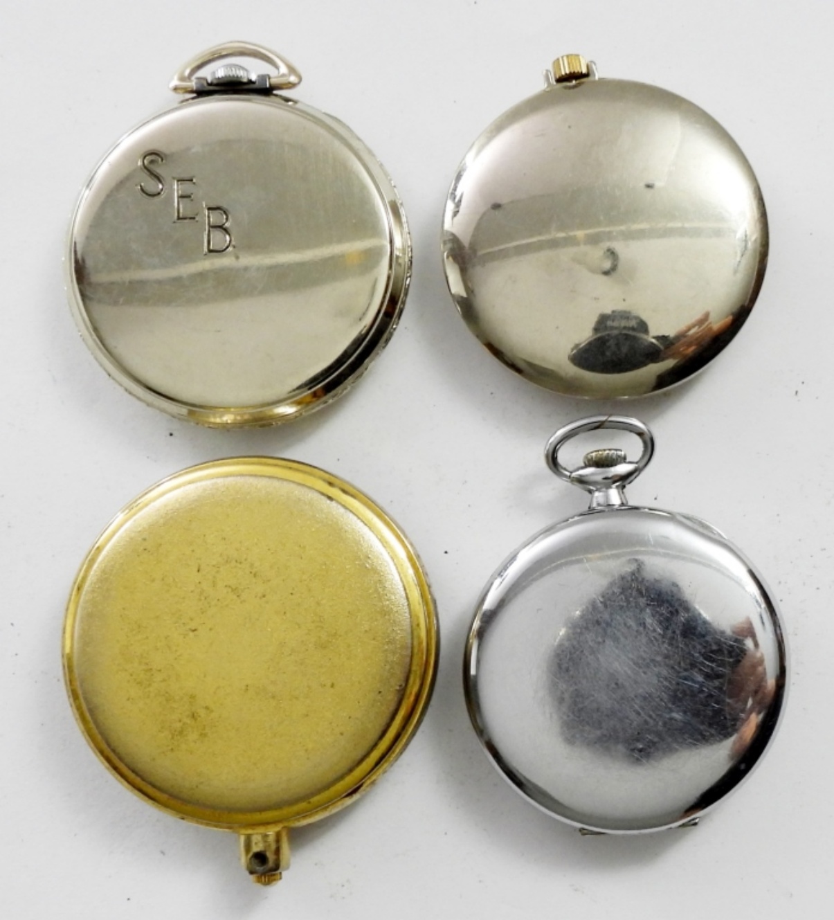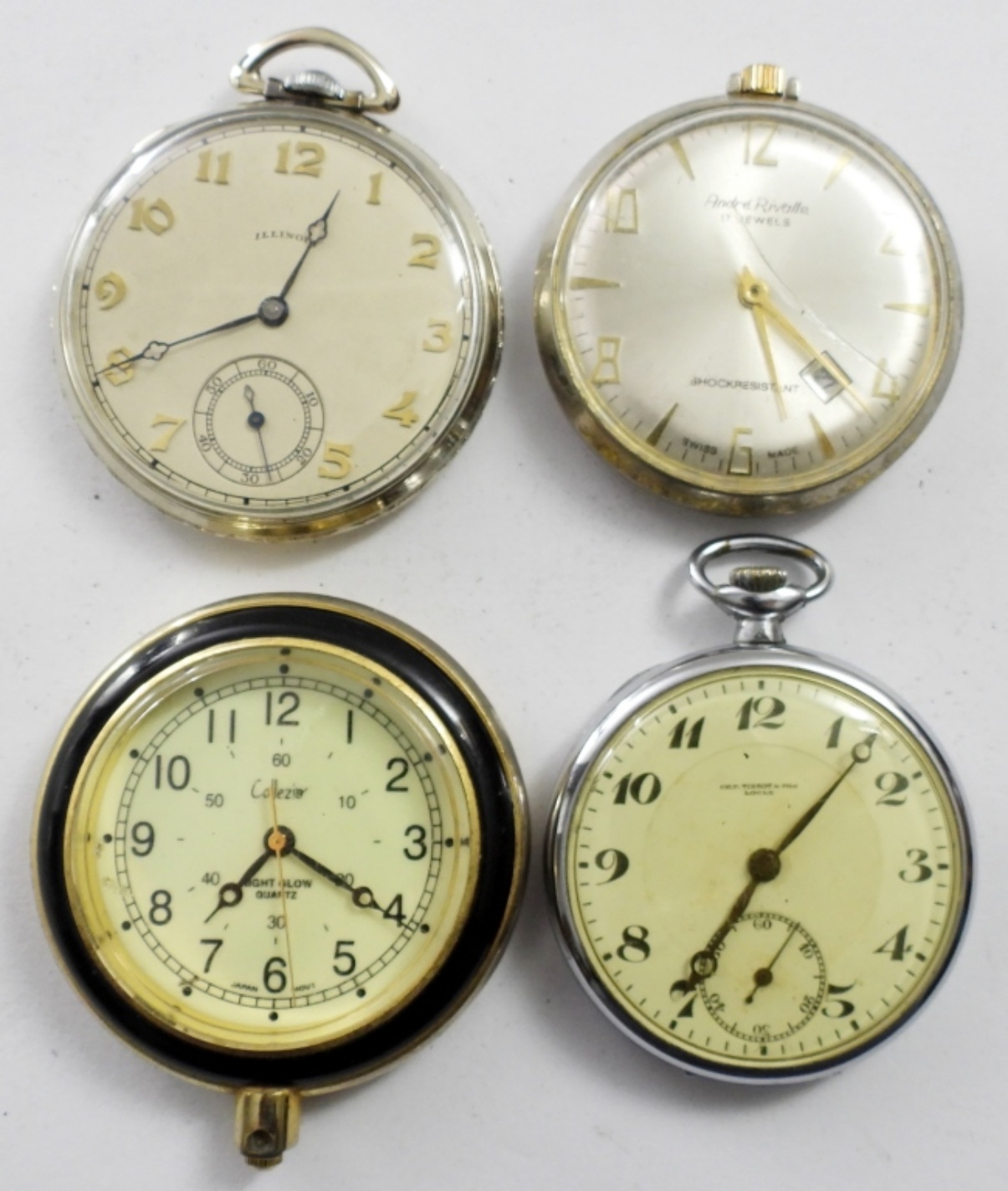 (4) OPEN FACE MEN’S POCKET WATCHES , ILLINOIS WIND UP POCKET WATCH , ANDRE RAVALLI 17 JEWELS DATE POCKET WATCH, A QUARTZ CILLEZIO POCKET WATCH & A TISSOT &FILS POCKET WATCH. 3 SILVER TONE 1 GOLD TONE (