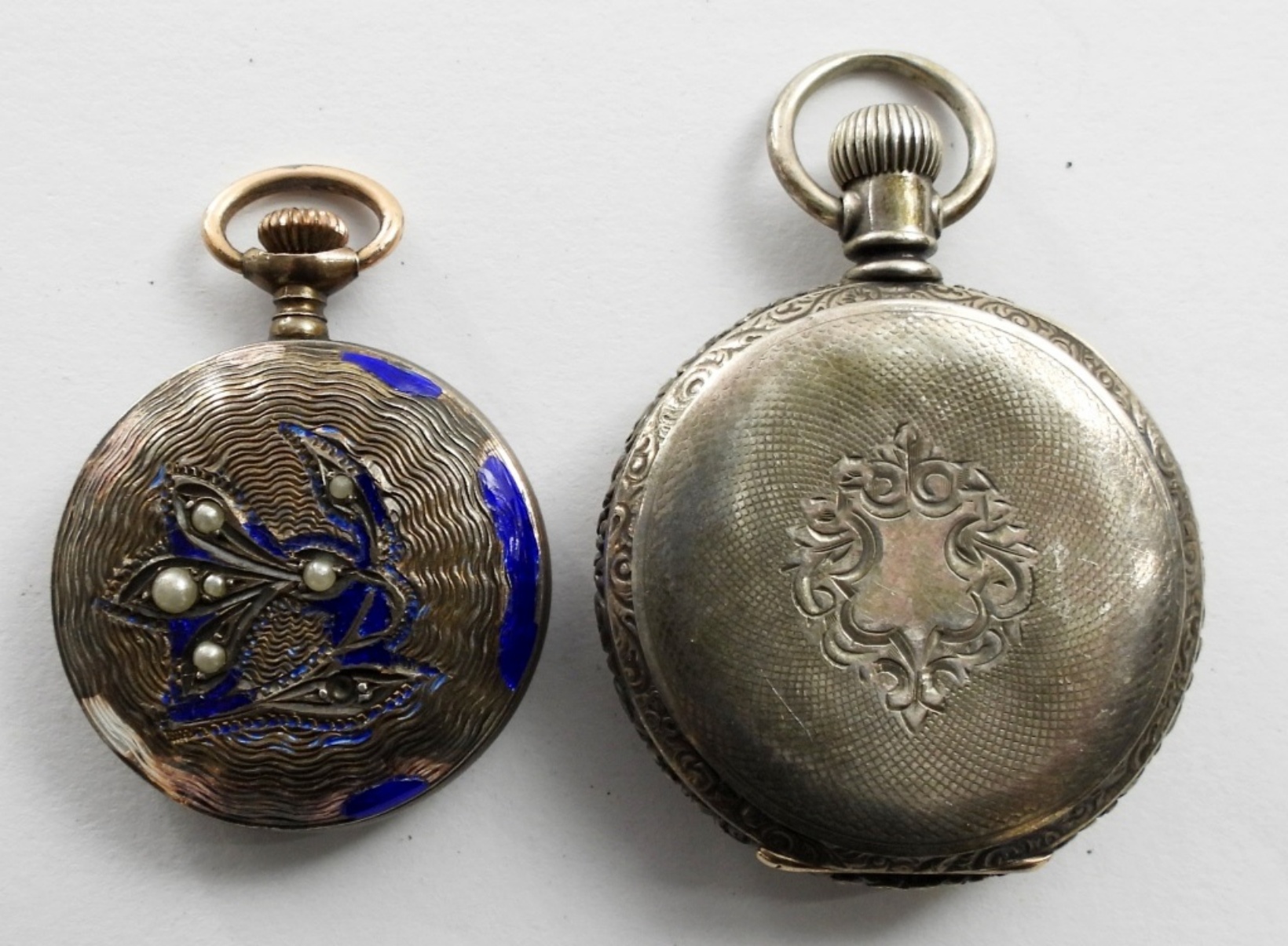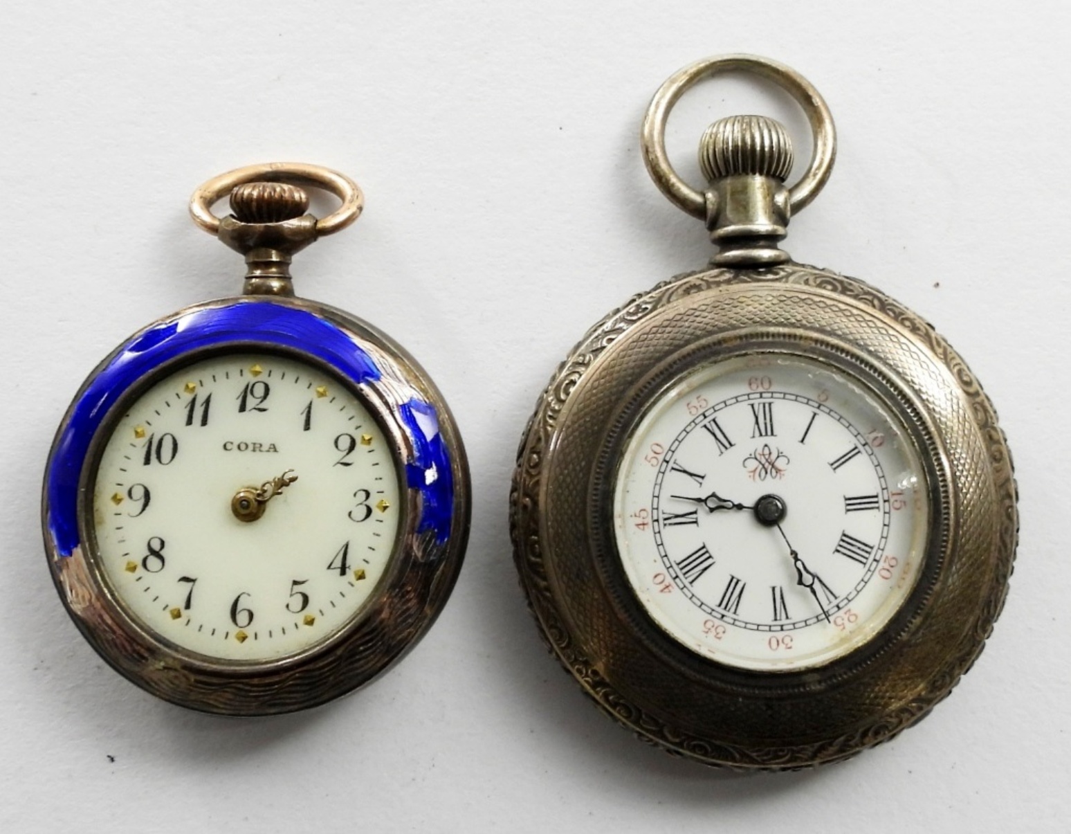 (2) VINTAGE LADIES POCKET WATCHES,1891 SIZE 0 # 6596089 7 JEWEL GRADE 60 LADIES POCKET WATCH, AND A CORA 935 SILVER (4.8DWT) LADIES POCKET WATCH WITH SEED PEARLS AND BLUE CHIPPED ENAMEL. NOT TESTED AS TO WORKING OR