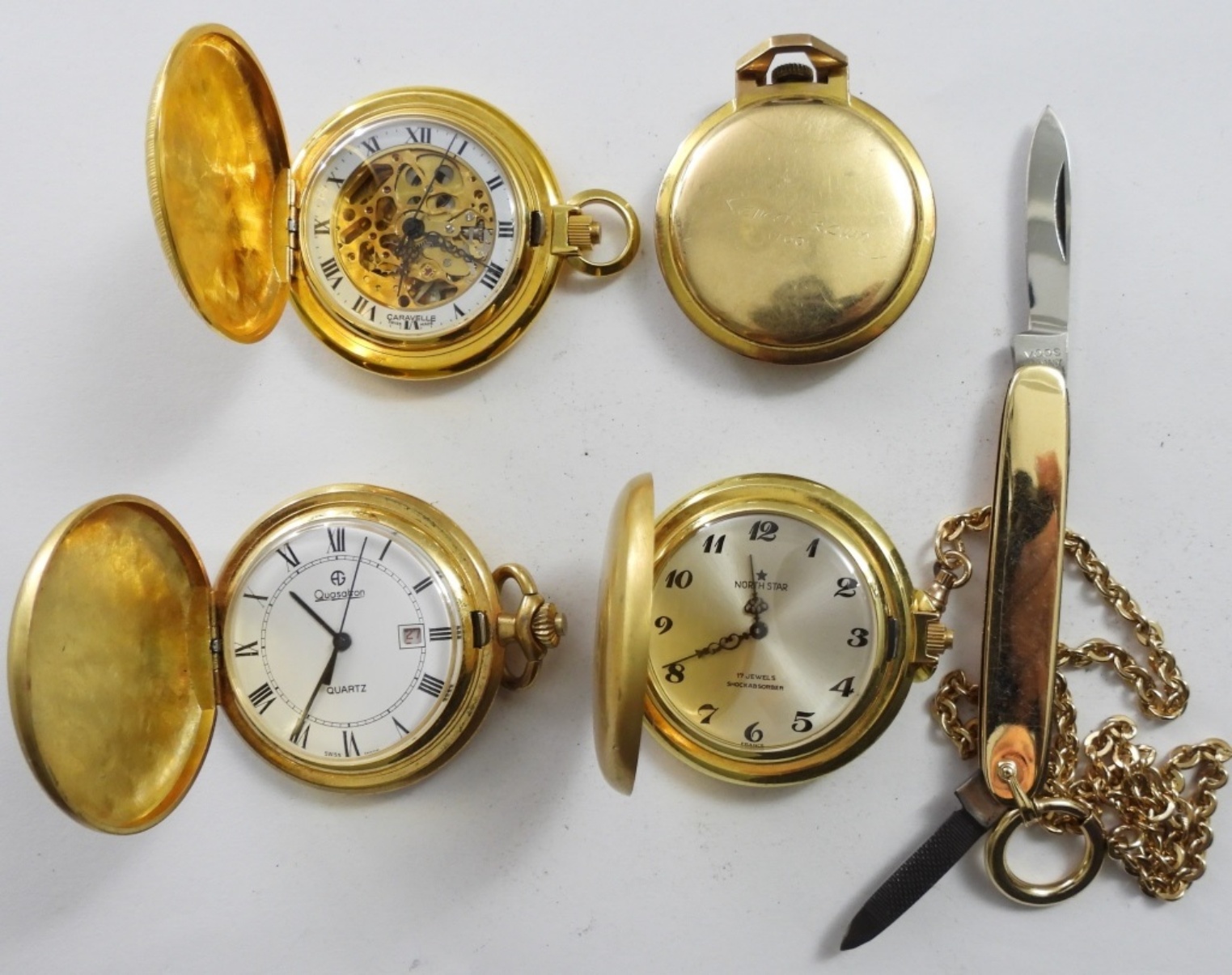 (3) GOLD TONE HUNTING WATCHES , 2 WIND UP NORTHSTAR 17 JEWELS WITH A GOLD TONE CHAIN ,CARAVELLE AND A QUARTZ DATE POCKET WATCH AND AN OPEN FACE SEIKO WIND UP POCKET WATCH. ALL ARE GOLD TONE ( NOT TESTED AS TO KEEPING
