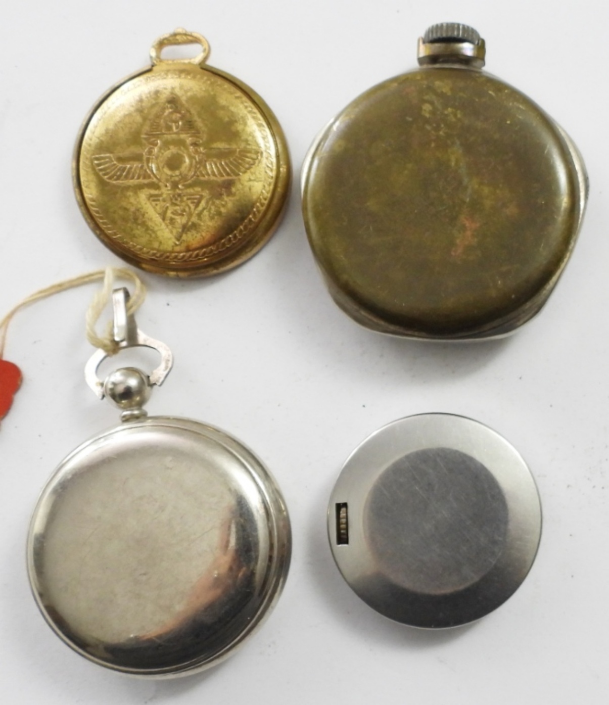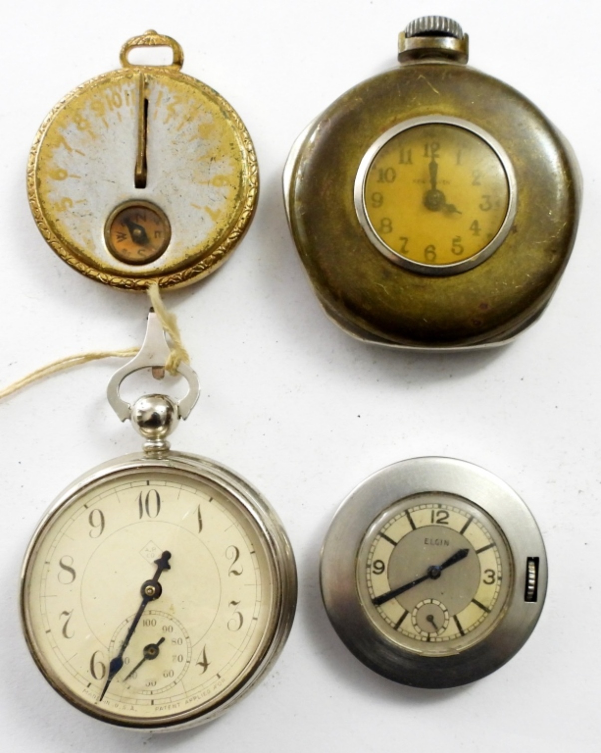 (3) VINTAGE POCKET WATCHES & COMPASS. NEW HAVEN, ELGIN AND MORE 9 NOT TESTED AS TO KEEPING TIME OR NOT )