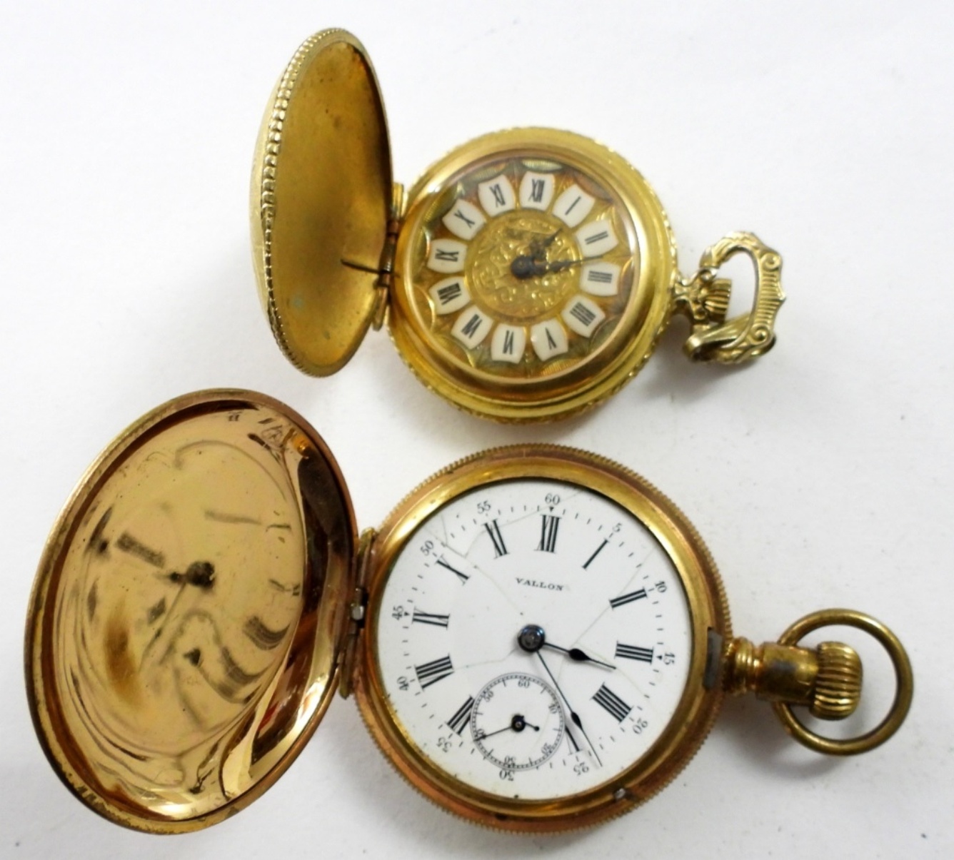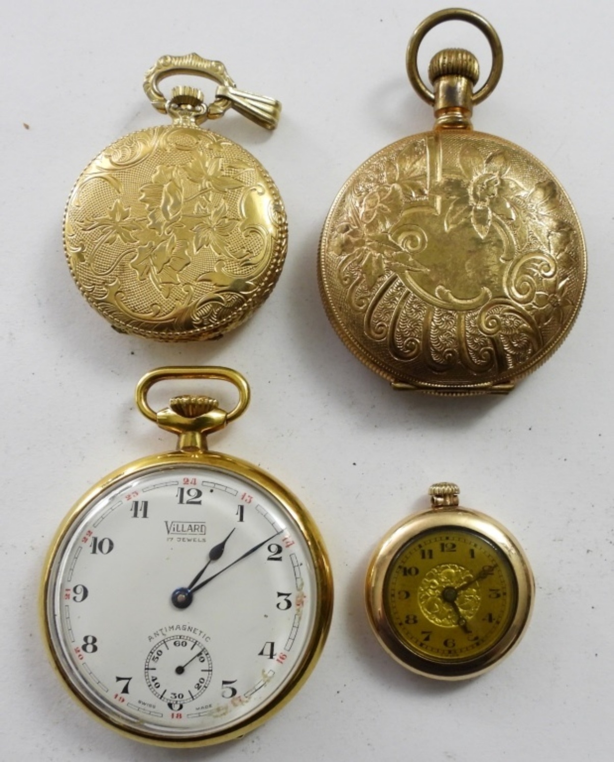 (4) VINTAGE WIND-UP POCKET WATCHES ,VALLON #78369,BELLE LOUSE , VILLARD 17 JEWELS ( RUNNING) & NUMA DROZ 16 JEWEL. THEY ALL MAY NEED SERVICE OR REPAIR. NOT TESTED AS TO KEEPING TIME OR NOT