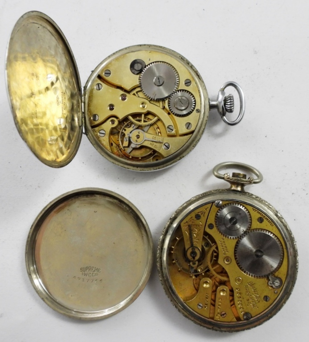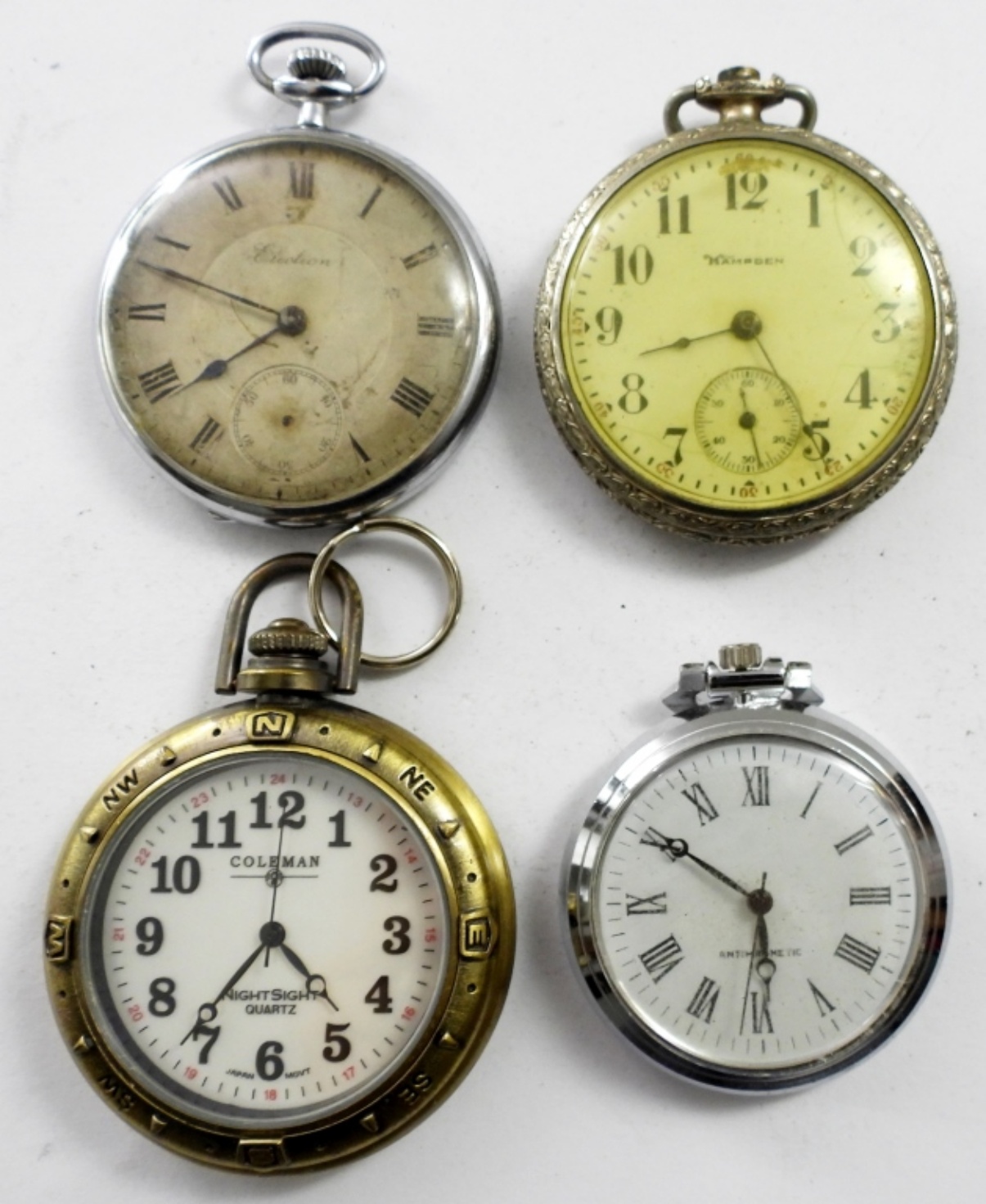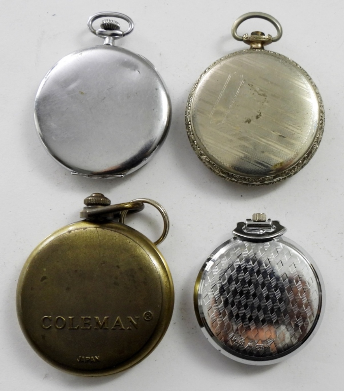 4 VTG OPEN FACE POCKET WATCHES . 3 SILVER TONE 1 GOLD TONE. COLEMAN, HAMPDEN, ELECTION & MORE. NOT TESTED AS TO KEEPING TIME OR NOT