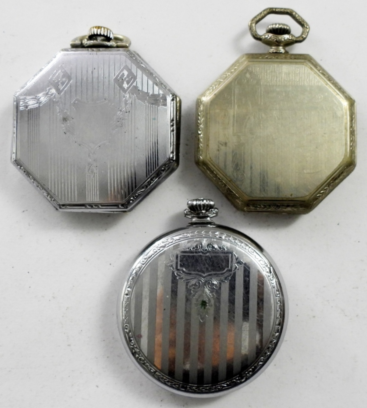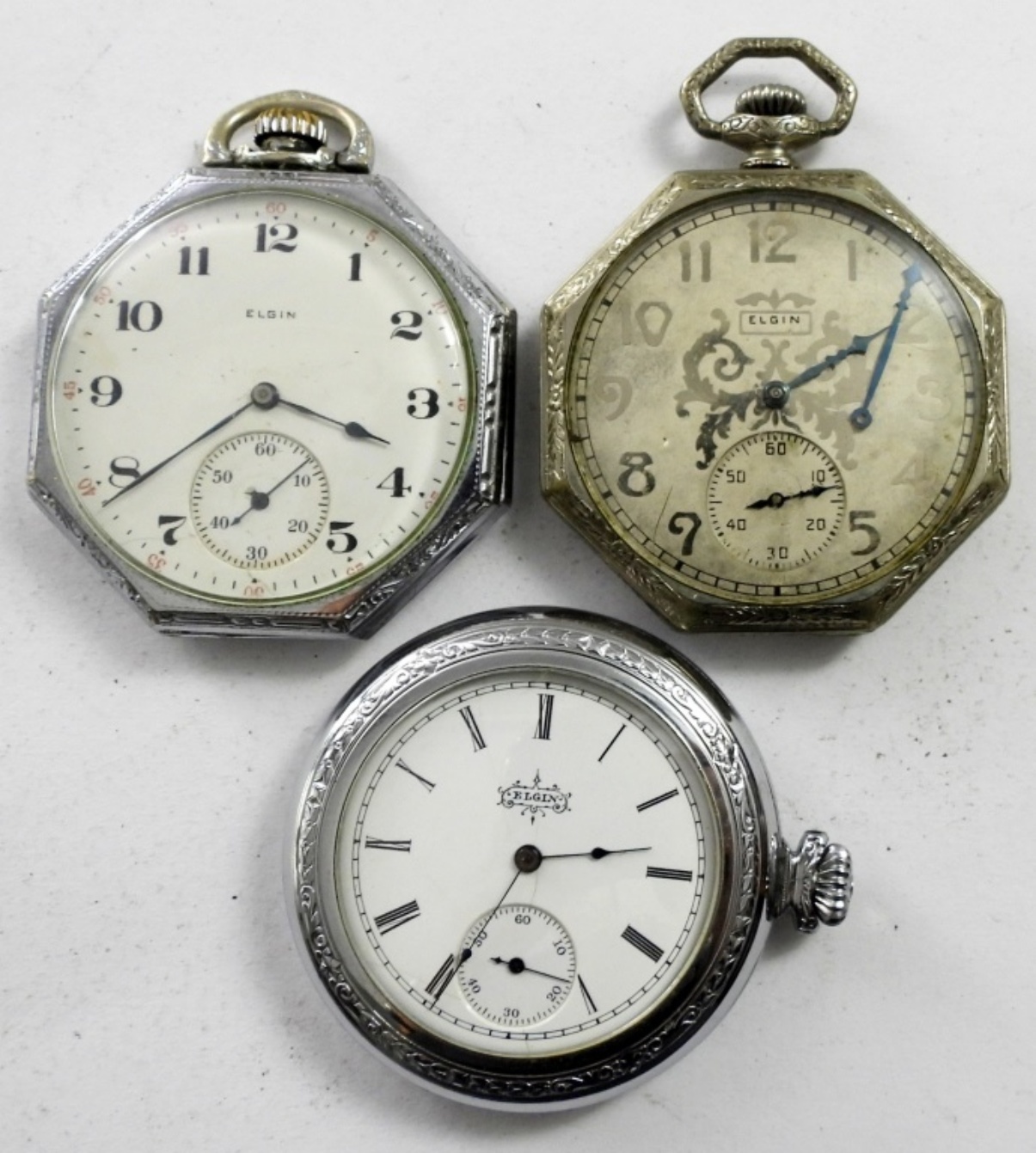 (3) ELGIN FANCY OPEN FACE POCKET WATCHES SILVER TONE , NOT RUNNING MAY NEED SERVICE AND REPAIR