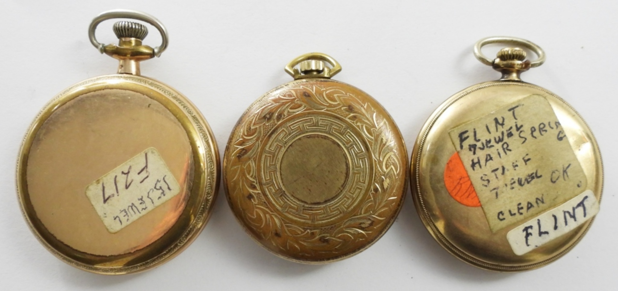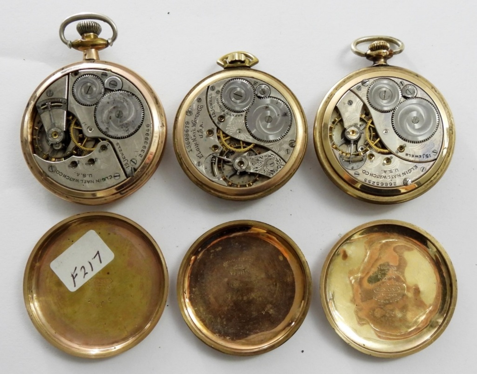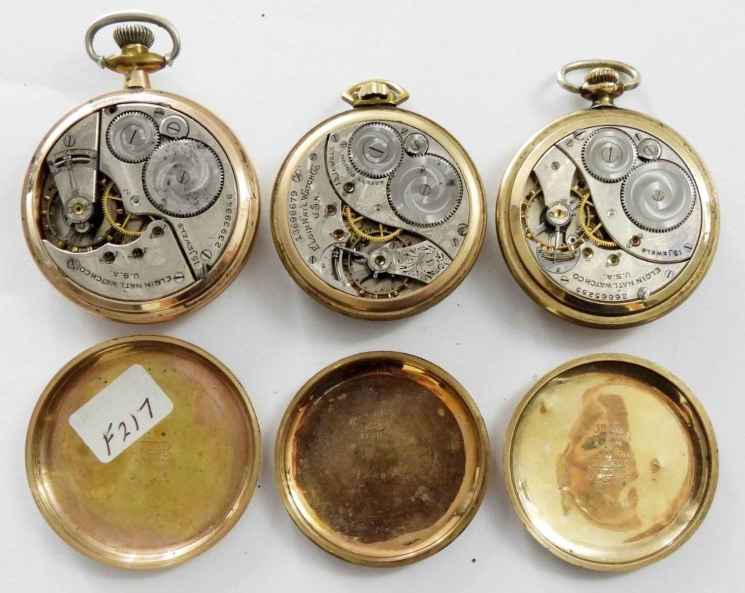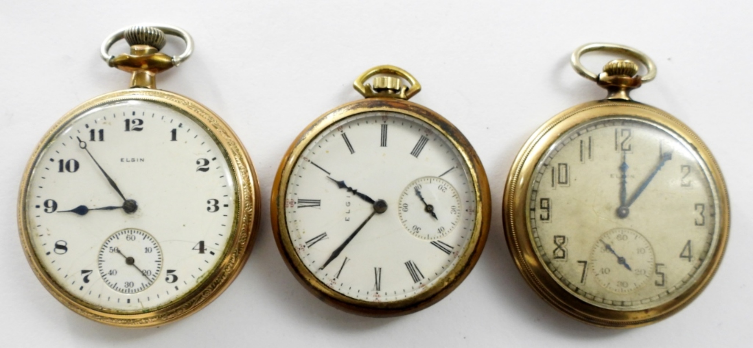 (3) VTG ELGIN GOLD TONE POCKET WATCHES ,1909 12 SIZE #13698679, 15 JEWELS GRADE 314, 1921 16 SIZE # 23939946, 15 JEWELS GRADE 313, 1924 12 SIZE #26865255, 15 JEWELS GRADE 315,( NOT WORKING NEEDS SERVICE & REPAIR)