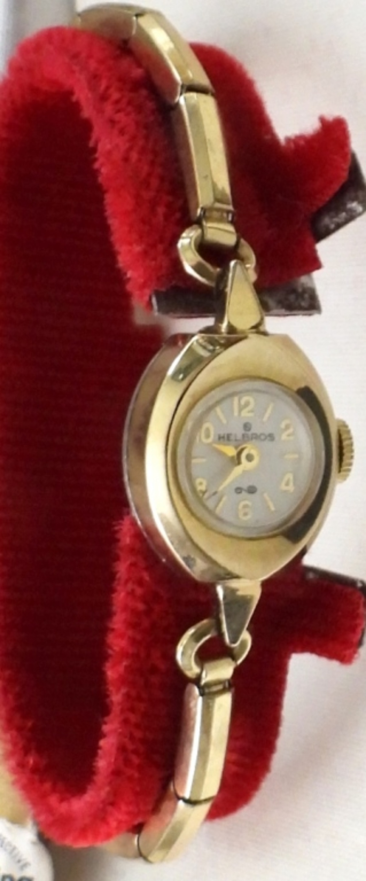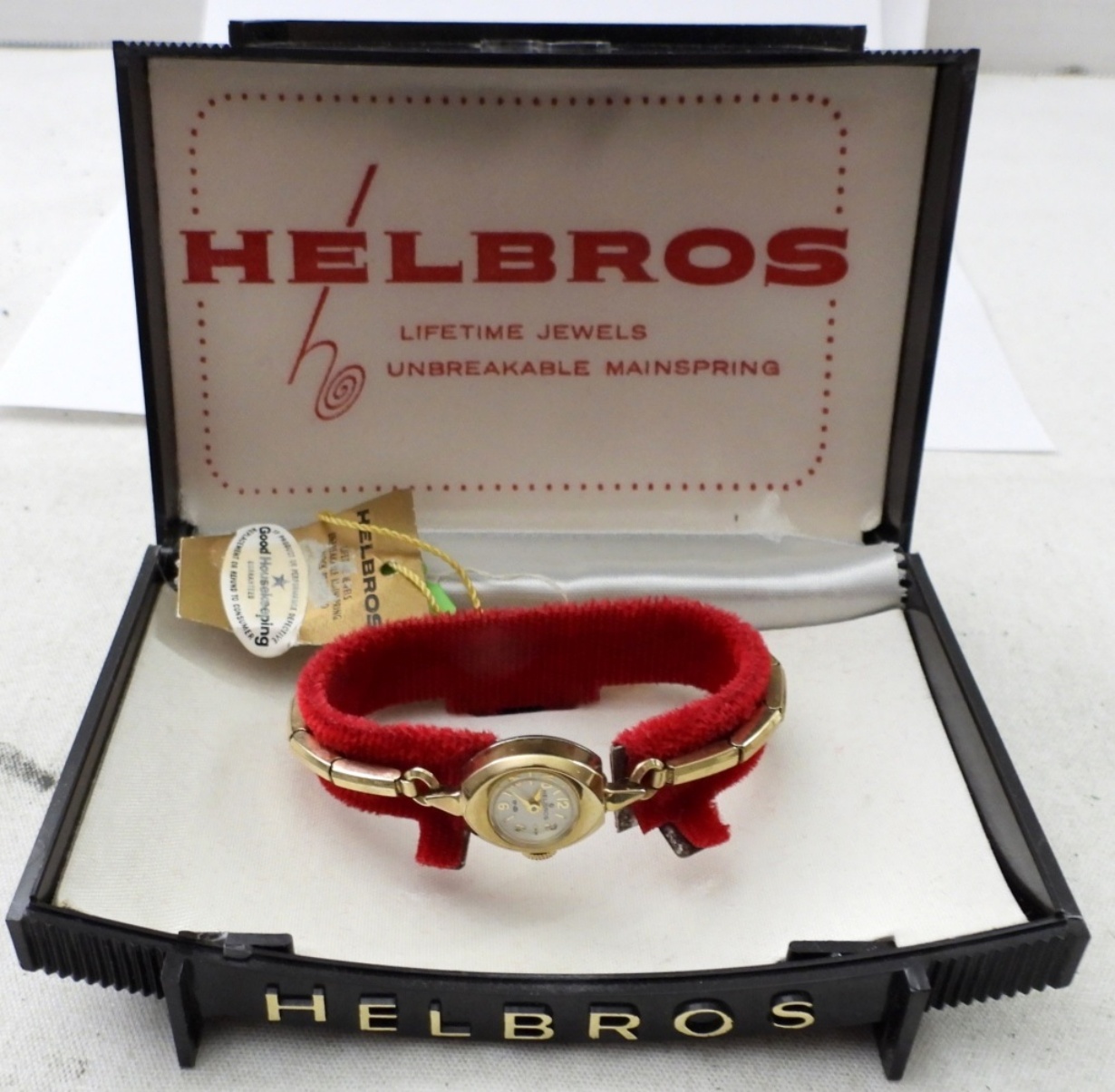 VINTAGE HELBROS LADIES WRIST WATCH. ROUND FACE 1/20 10K GF SHELLS, STRETCHY BAND IN ORIGINAL BOX WITH TAGS STILL ON