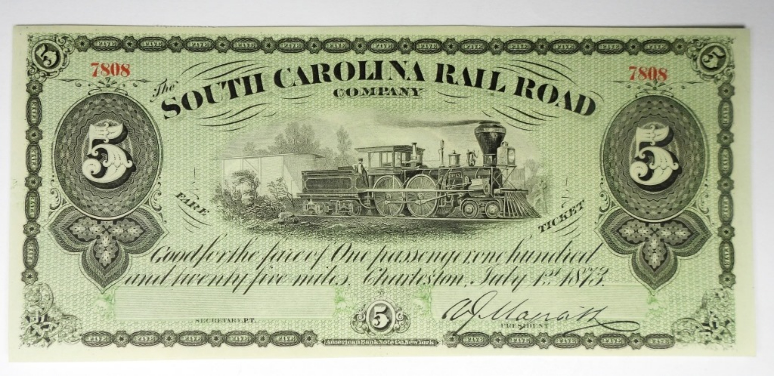 S.CAROLINA RAILROAD CO.$5 OBSOLETE NOTE