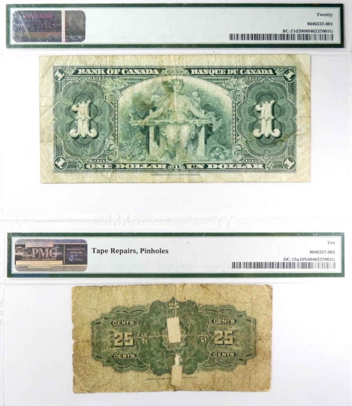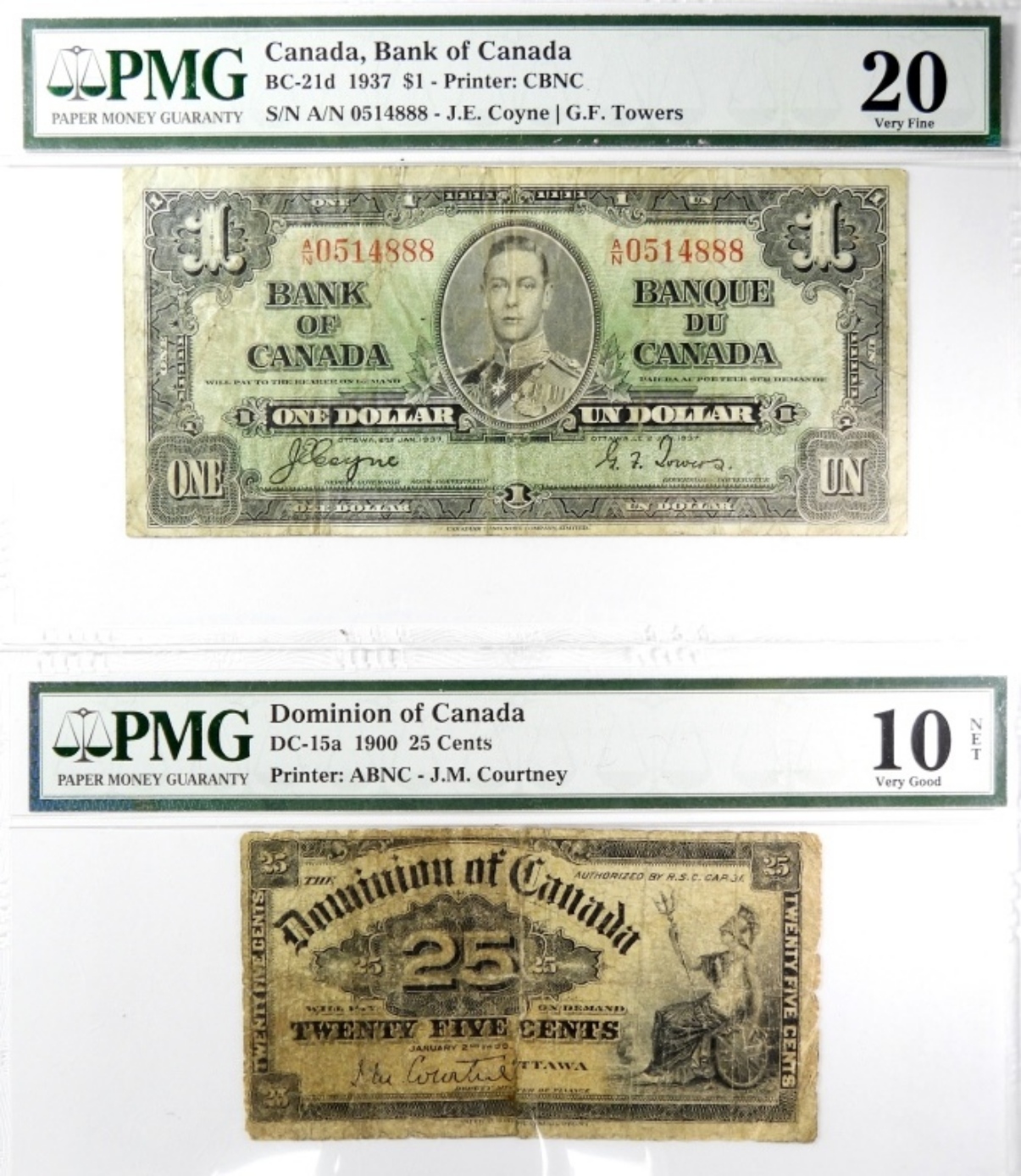 1900 25c DOMINION OF CANADA PMG 10 (VERY GOOD) & 1937 $1 CANADA ,BANK OF CANADA PMG 20 (VERY FINE )