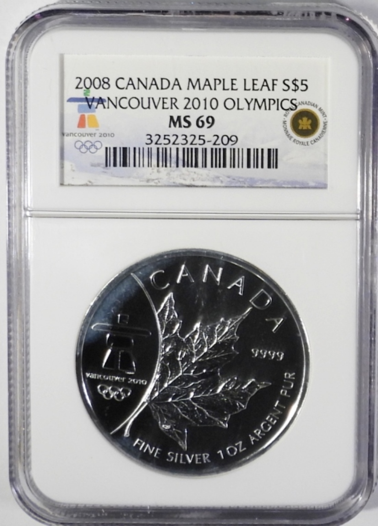 2008 CANADA MAPLE LEAF S$5 VANCOUVER 2010 OLYMPICS MS 69 NGC