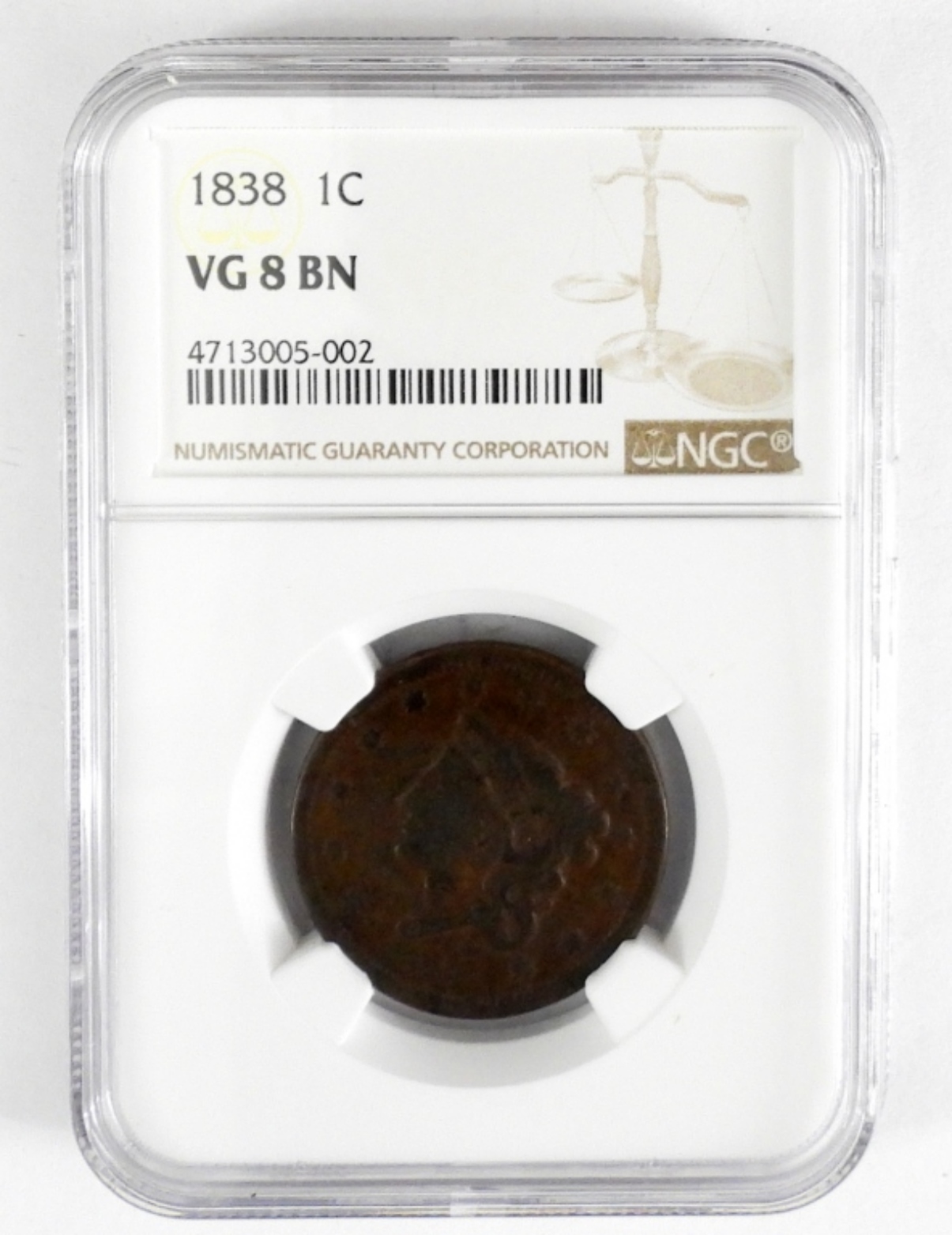 1838 LIBERTY HEAD LARGE CENT NGC VG8 BN