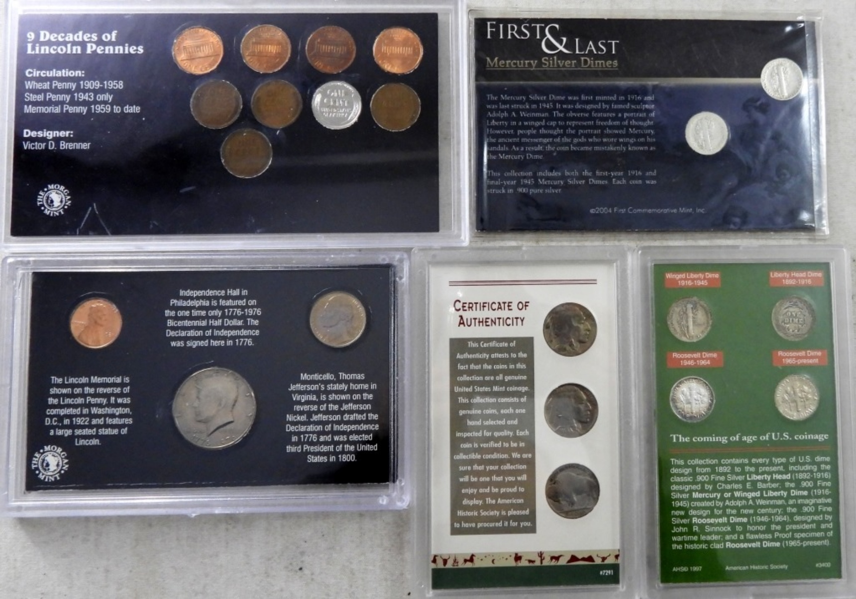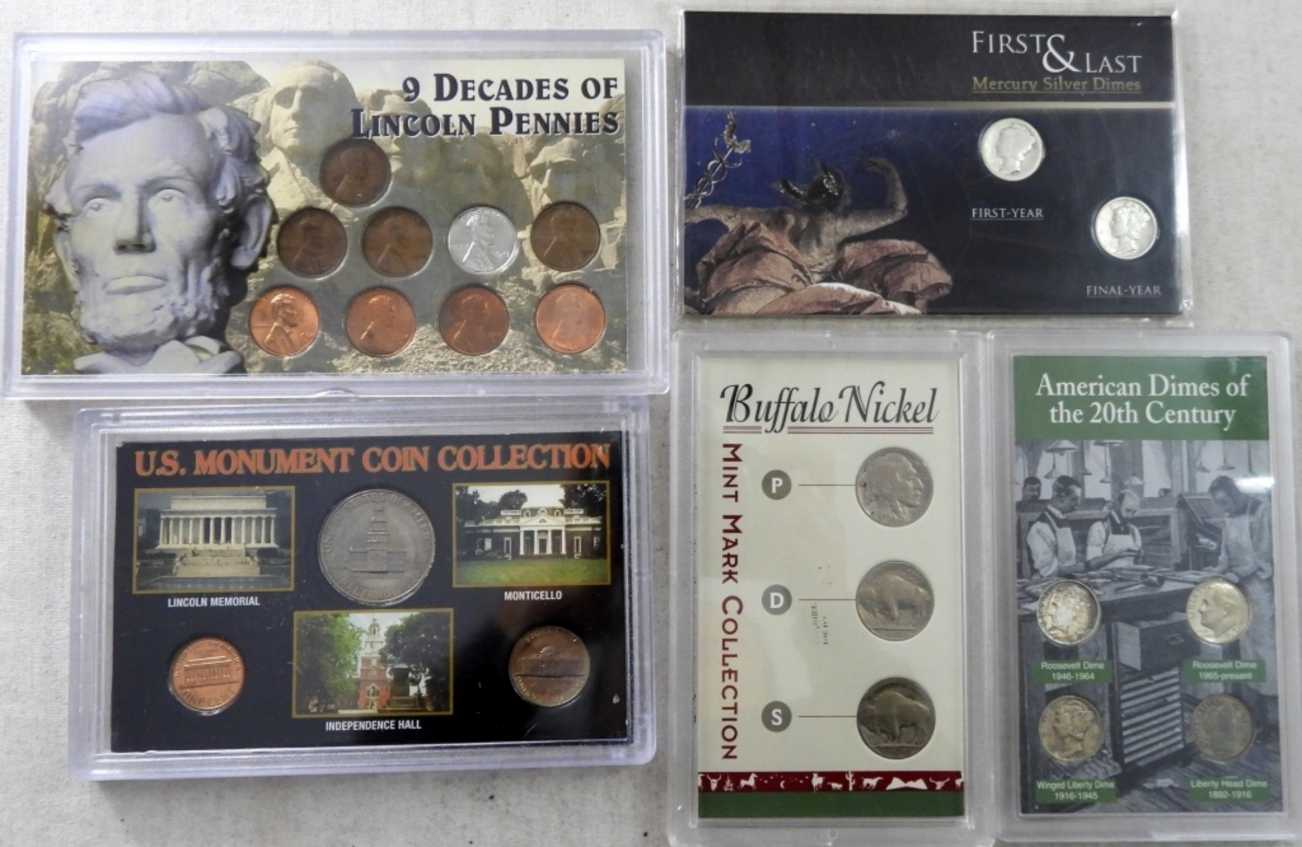of LINCOLN PENNIES, AMERICAN DIMES of 20th CENTURY, U.S. MONUMENT COLLECTION, BUFFALO NICKEL MINT MARK SET, FIRST & LAST MERCURY DIME