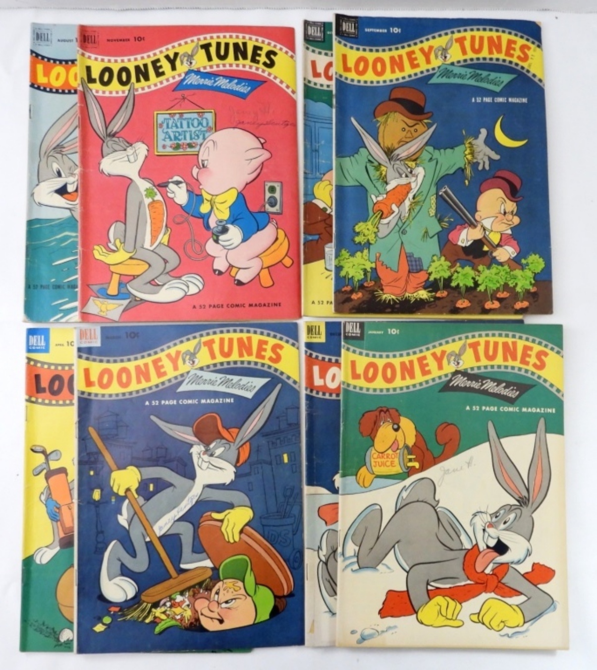 (8) LOONY TUNES & MERRIE MELODIES DELL COMICS,1950S, SMALL WRITING/SCRIBBLES ON SOME COVERS, NO 138, 137, 135, 134, 133, 132, 131, & 130. NO 130 MISSING HALF FRONT COVER, OTHERWISE ALL IN GOOD CONDITON