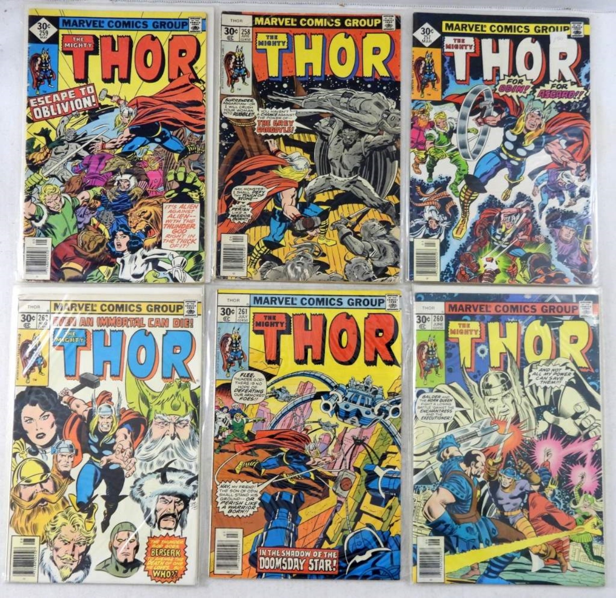(6) BRONZE MARVEL THE MIGHTY THOR #257 FOR ODIN! FOR ASGARD!,#258 THE GREY GARGOYLE,#259 ESCAPE TO OBLIVION!,#260,#261 DOOMSDAY STAR!,#262 EVEN AN IMMORTAL CAN DIE!( G-VG+)