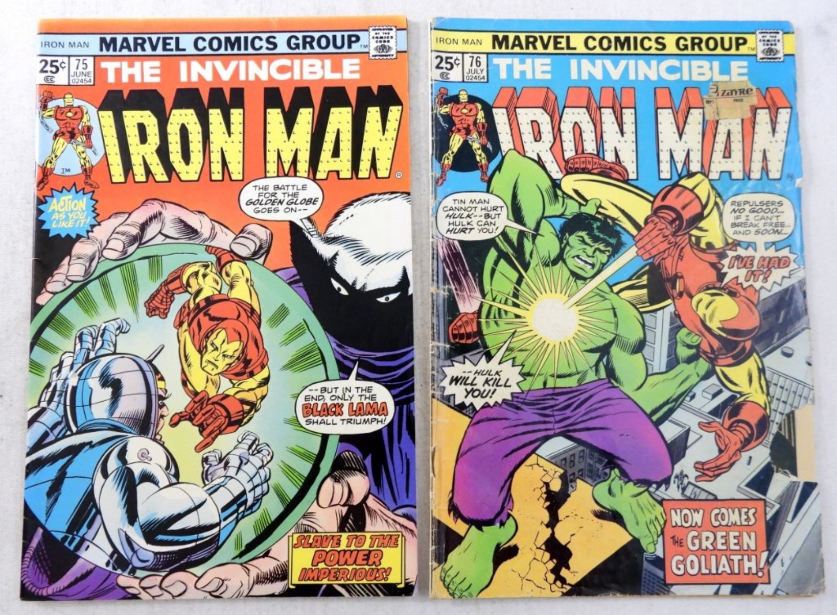 (2) BRONZE MARVEL IRON MAN # 75 SLAVE TO THE POWER IMPERIOUS! & #76 THE INCREDIBLE HULK!!(G/VG)