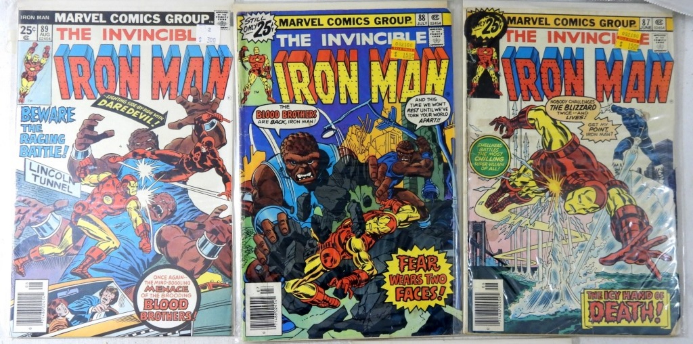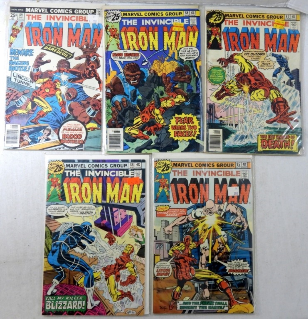 (5) BRONZE MARVEL IRON MAN #85THE FREAK!, #861ST APPEARANCE OF THE BLIZZARD!,#87THE ICY HAND OF DEATH,#88 FEAR WEARS TWO FACES,#89 MENACE OF THE BLOOD BROTHERS( FAIR-VG)