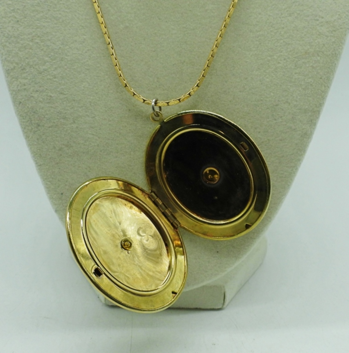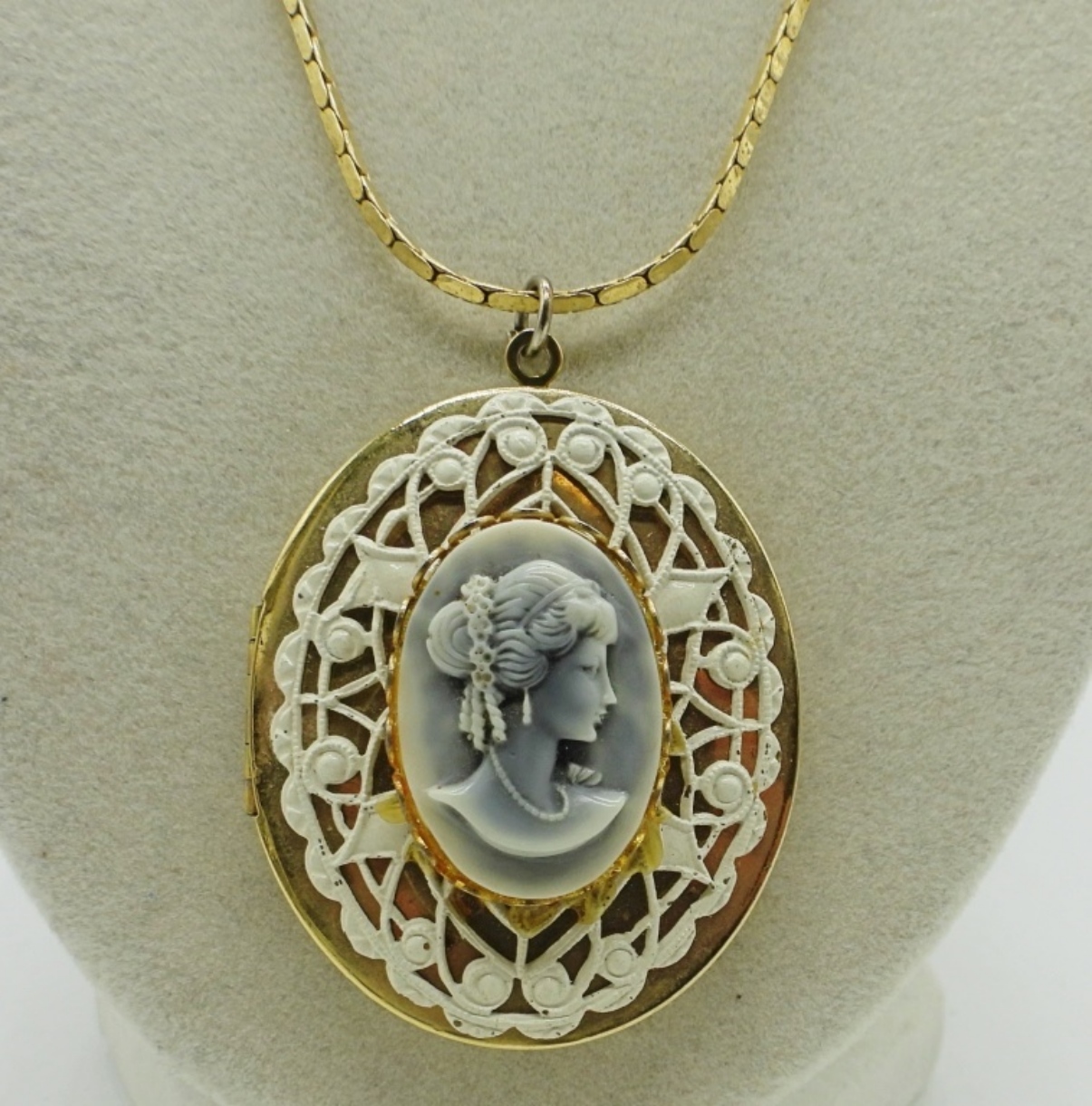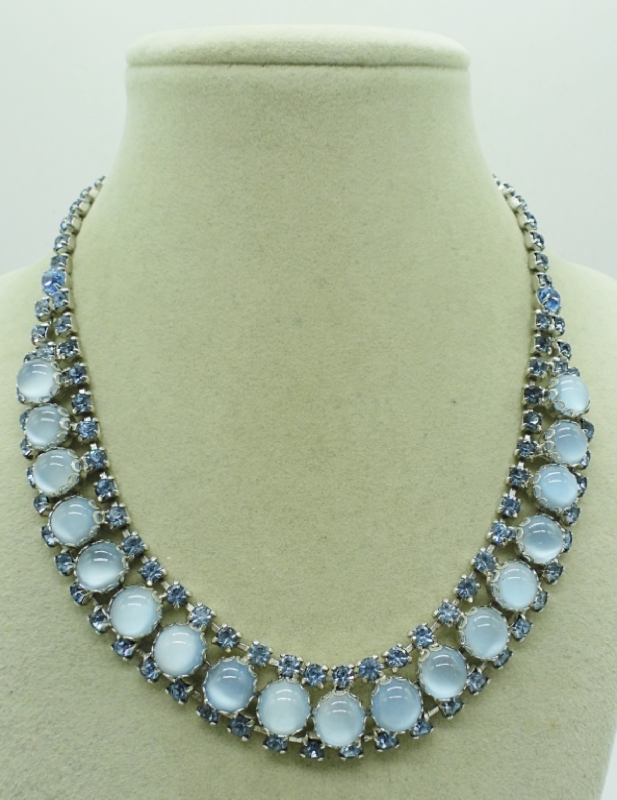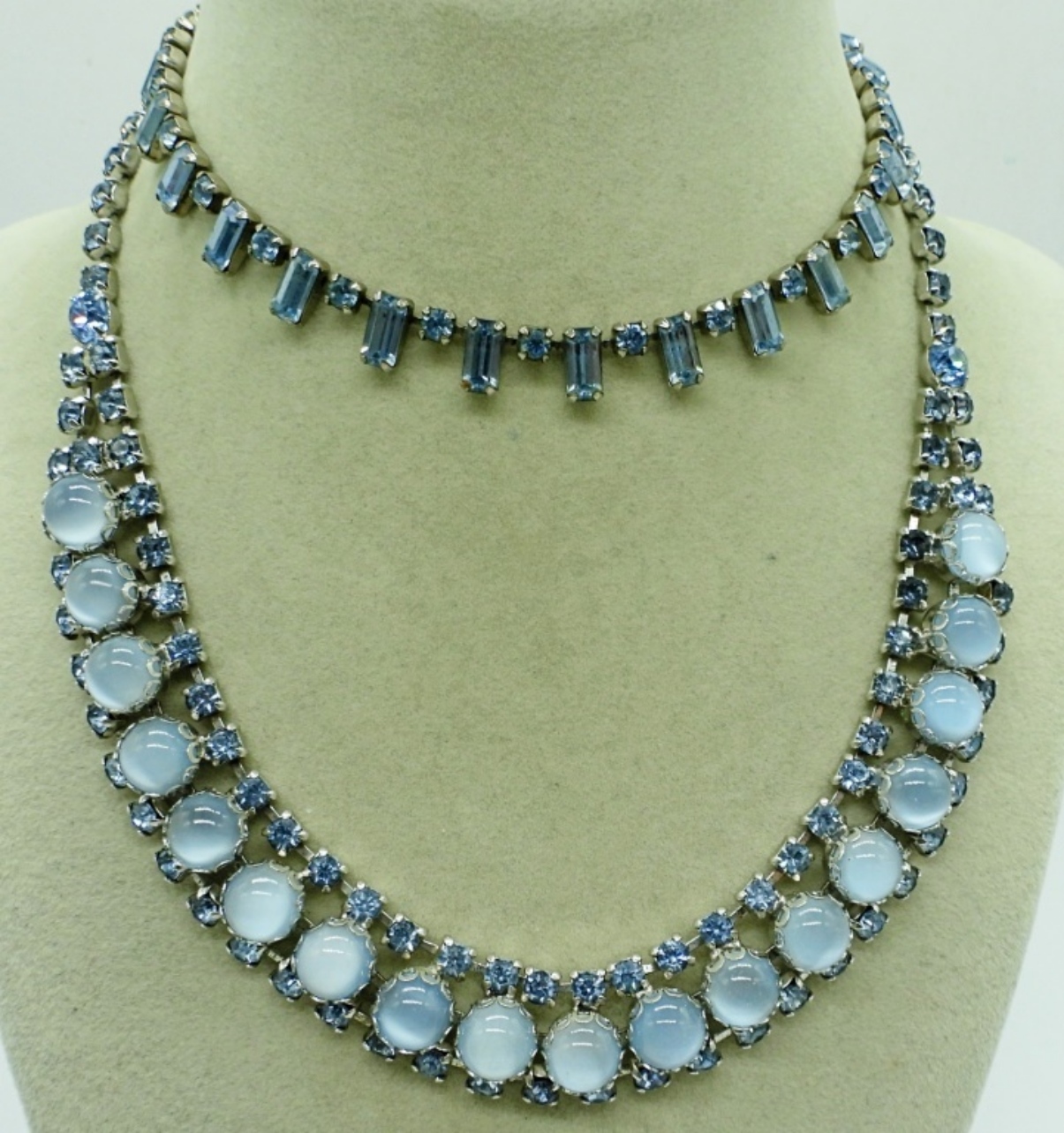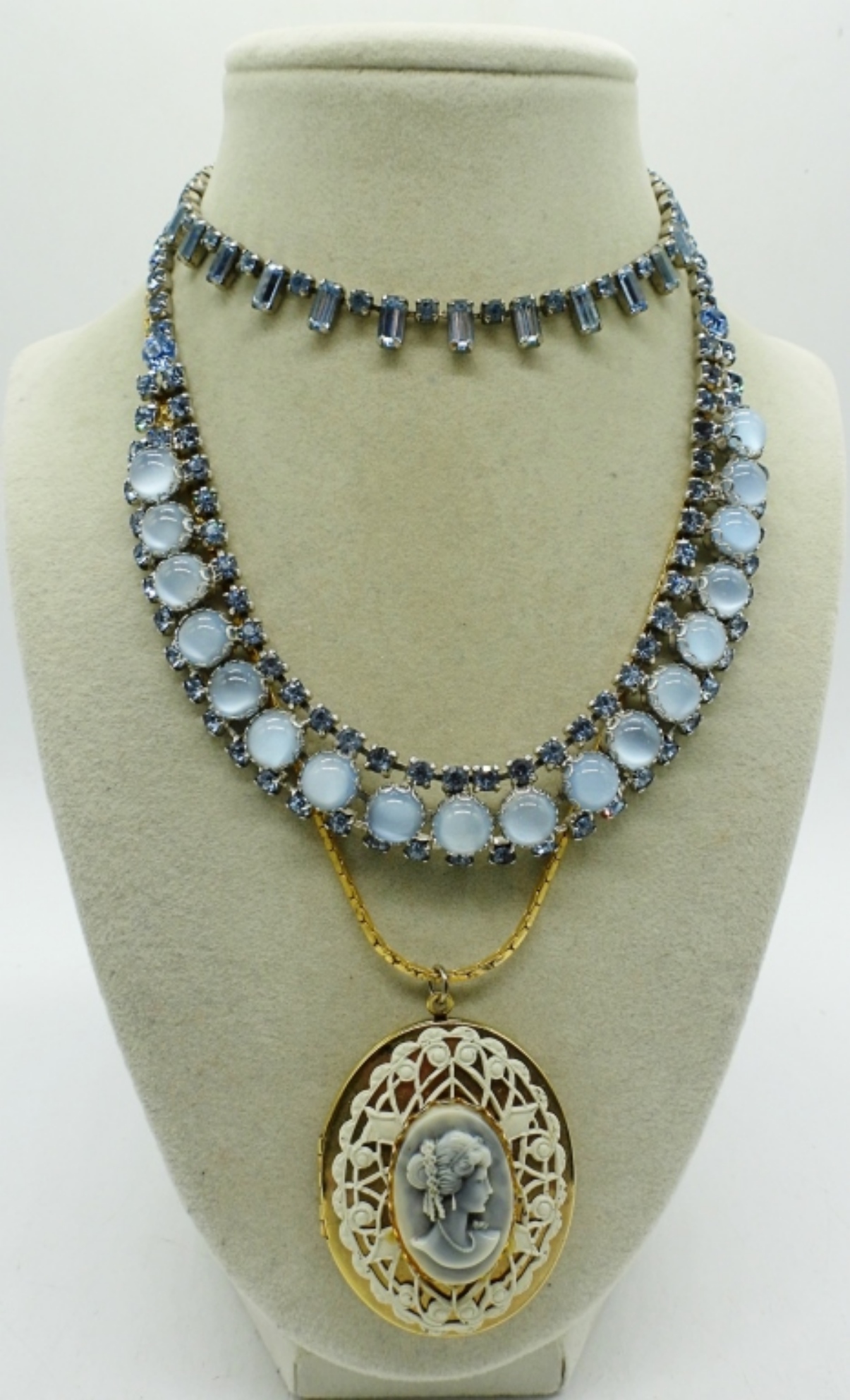 THREE VINTAGE BLUE RHINESTONE & BLUE CAMEO LOCKET, NECKLACES. 11.5″, 16.5″ & 18″.