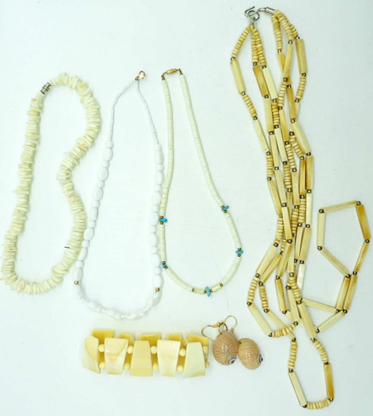 NECKLACES 16″-24″. STRETCHY BRACELET, 8″. SHELL PIERCED EARRINGS