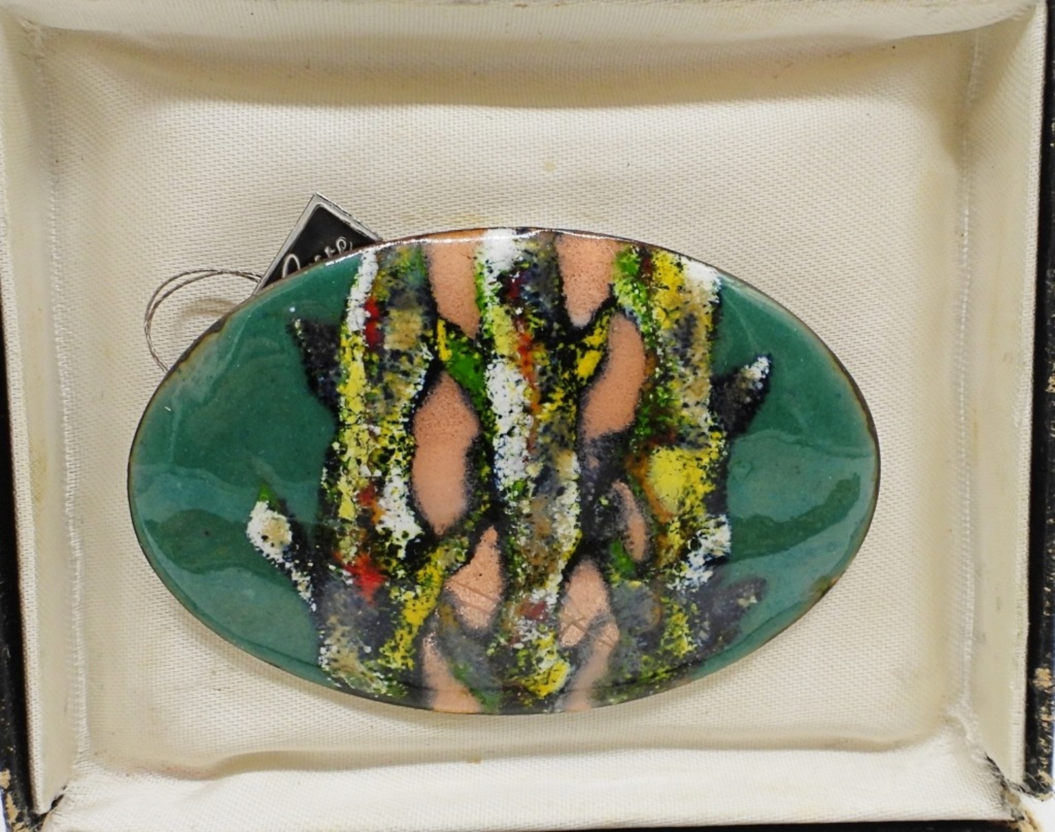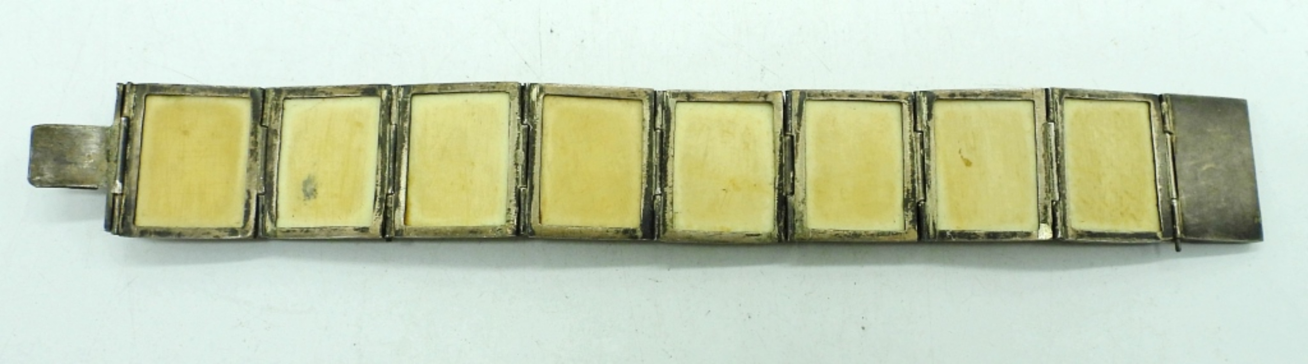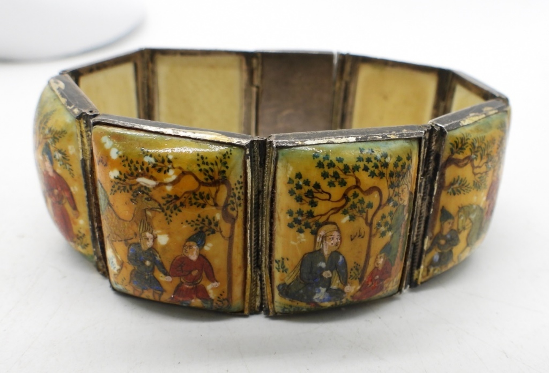 HAND PAINTED BONE, BRACELET 7″. HAND PAINTED BROOCH, 2 1/4″.