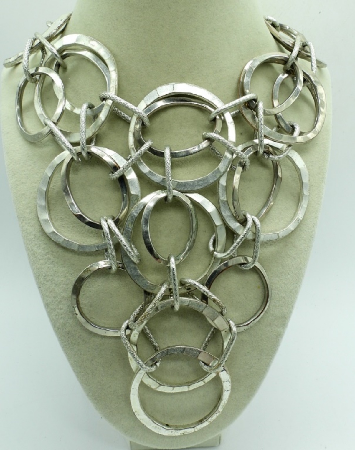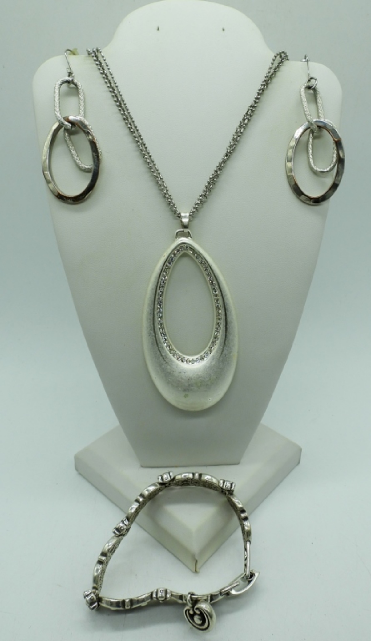 (4) LADIES SILVER TONE FASHION JEWELRY,18″MULTI LAYERED CHAIN NECKLACE WITH MATCHING EARRINGS ,32″ NECKLACE WITH SILVER TONE PENDANT AND A 3″ CLASP BRACELET