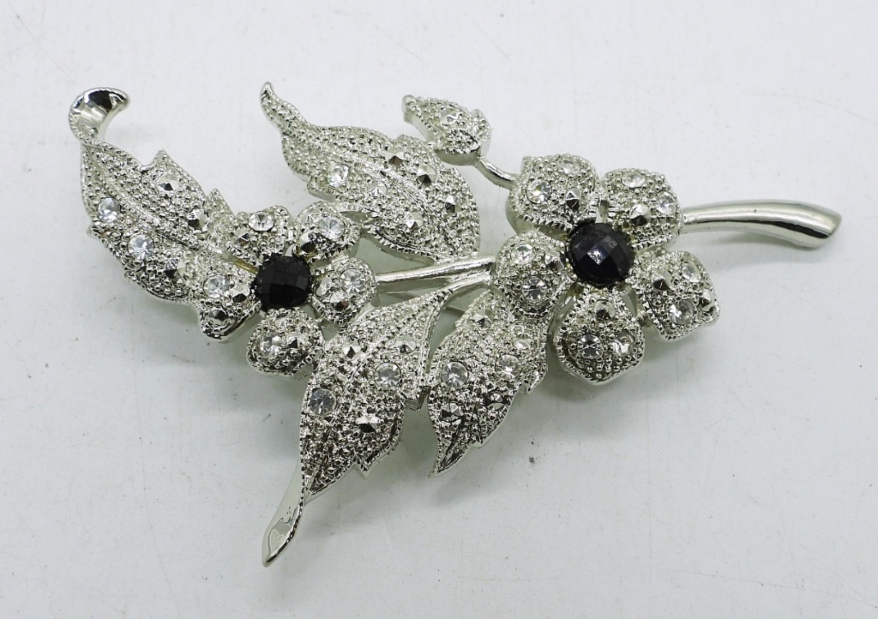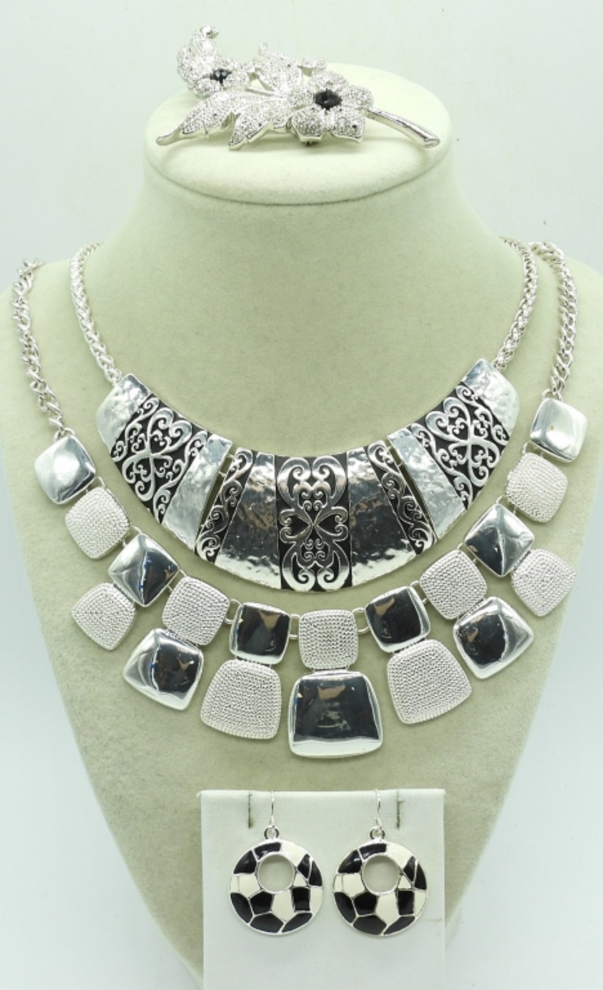 4 PIECE BLACK & SILVER TONE FASHION JEWELRY,18″ SILVER TONE NECKLACE,18″ BLACK & SILVER TONE NECKLACE,A SILVER TONE BROOCH WITH BLACK AND DIAMOND LIKE GEM STONES AND A PAIR OF BLACK & WHITE EARRINGS .