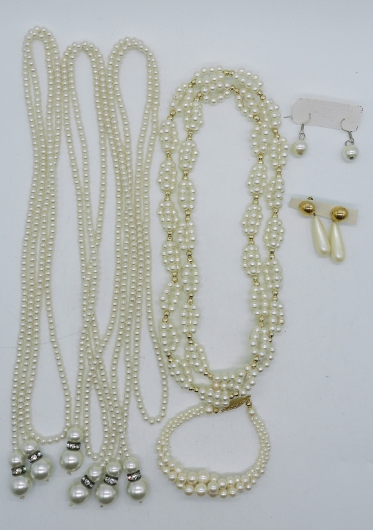 3 LARIAT FAUX PEARL NECKLACES, 40″. OTHER NECKLACE 32″. BRACELET 7″. TWO PAIR PIERCED EARRINGS