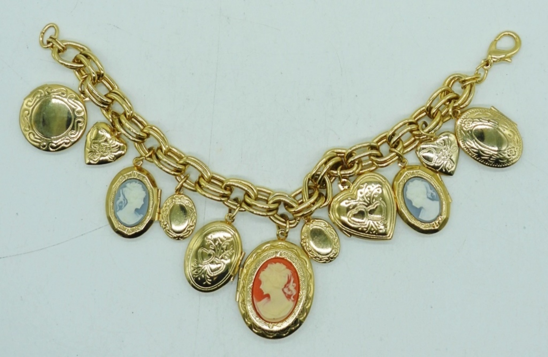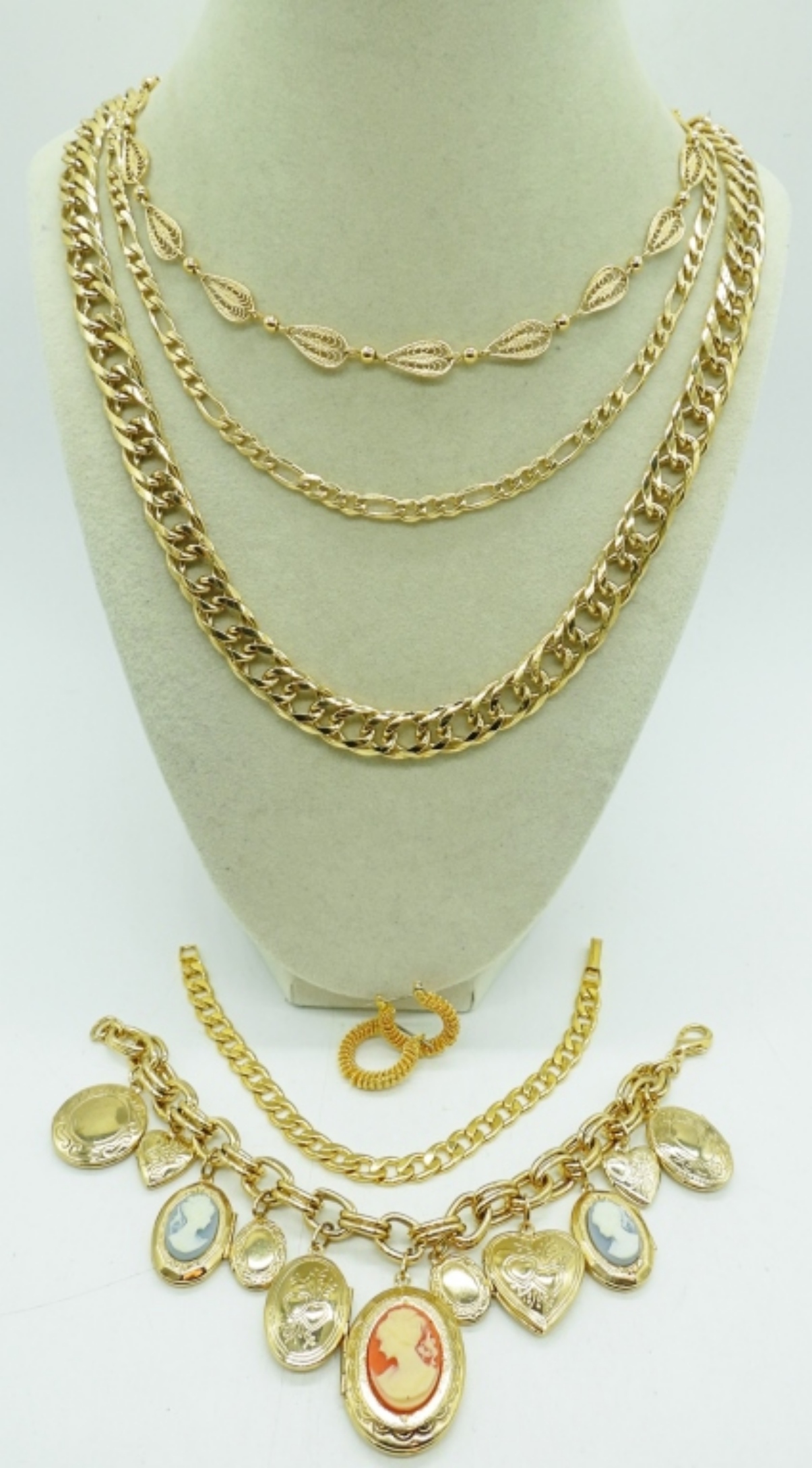 (3) GOLD TONE FASHION CHAINS, 24-30″. ONE PAIR PIERCED EARRINGS. TWO GOLD TONE BRACELETS, ONE A CHAIN AND THE OTHER FULL OF LOCKETS, 7-8″.