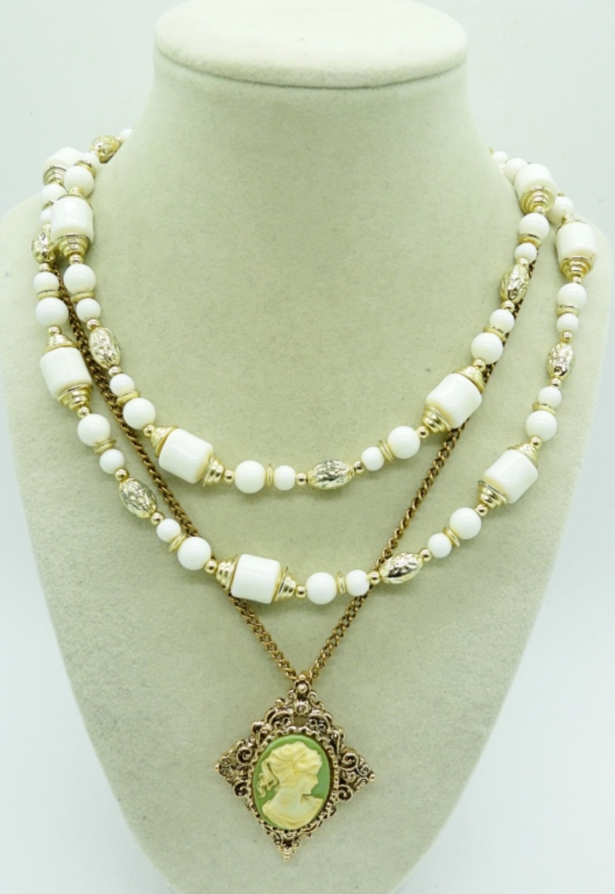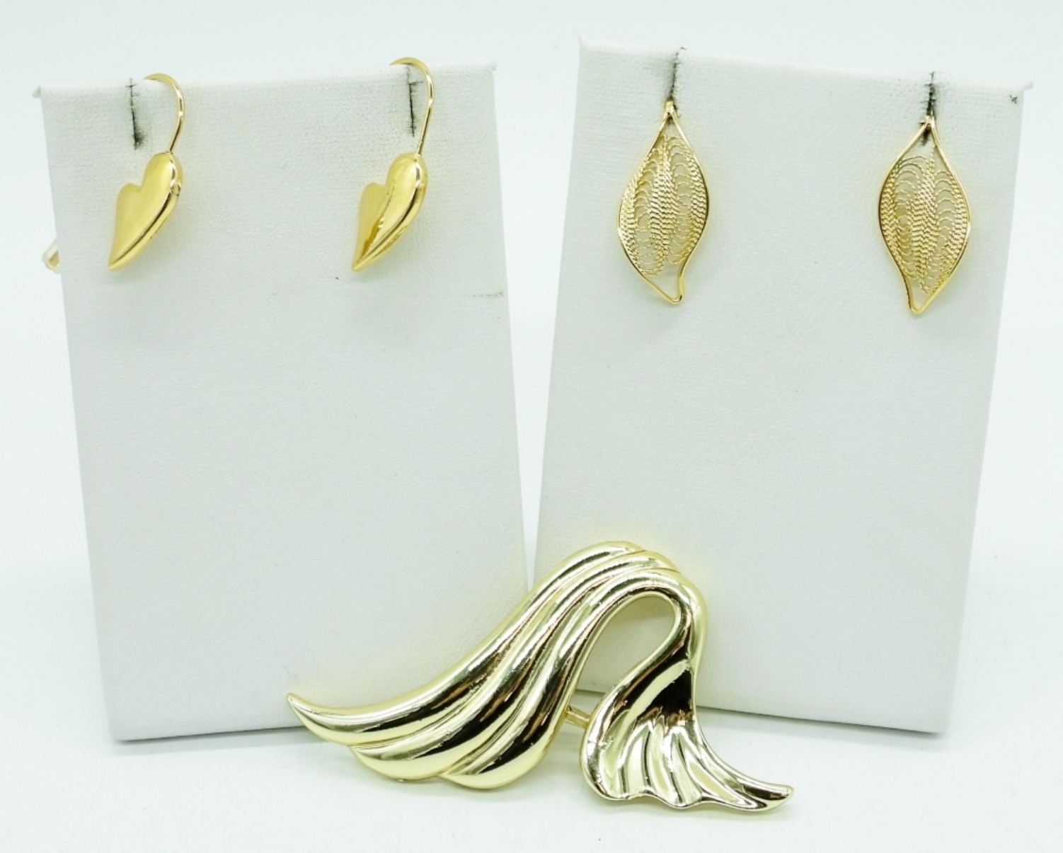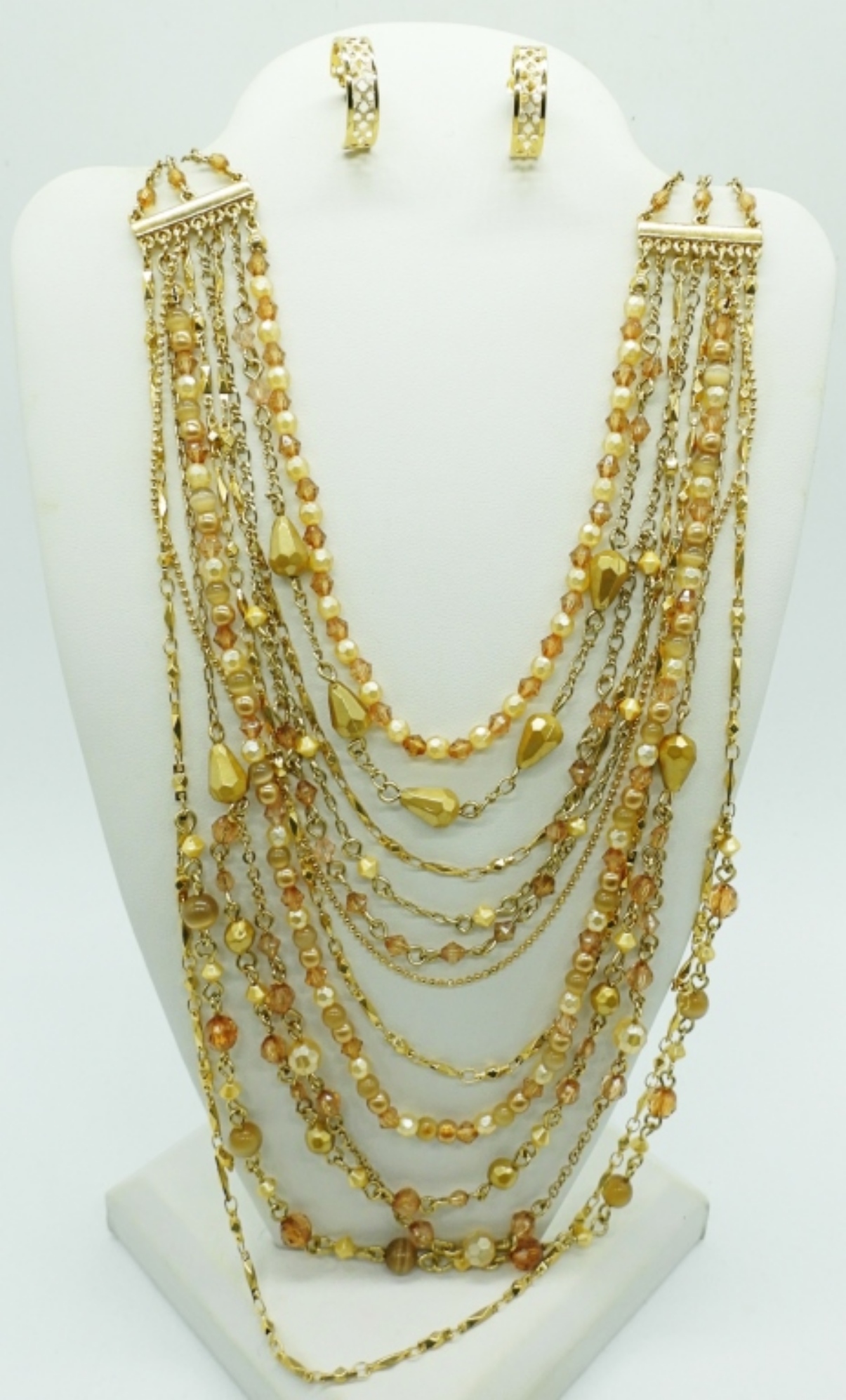 THREE GOLD TONE VINTAGE NECKLACES, 19″, 24″, 36″. THREE PAIR OF GOLD TONE PIERCED EARRINGS