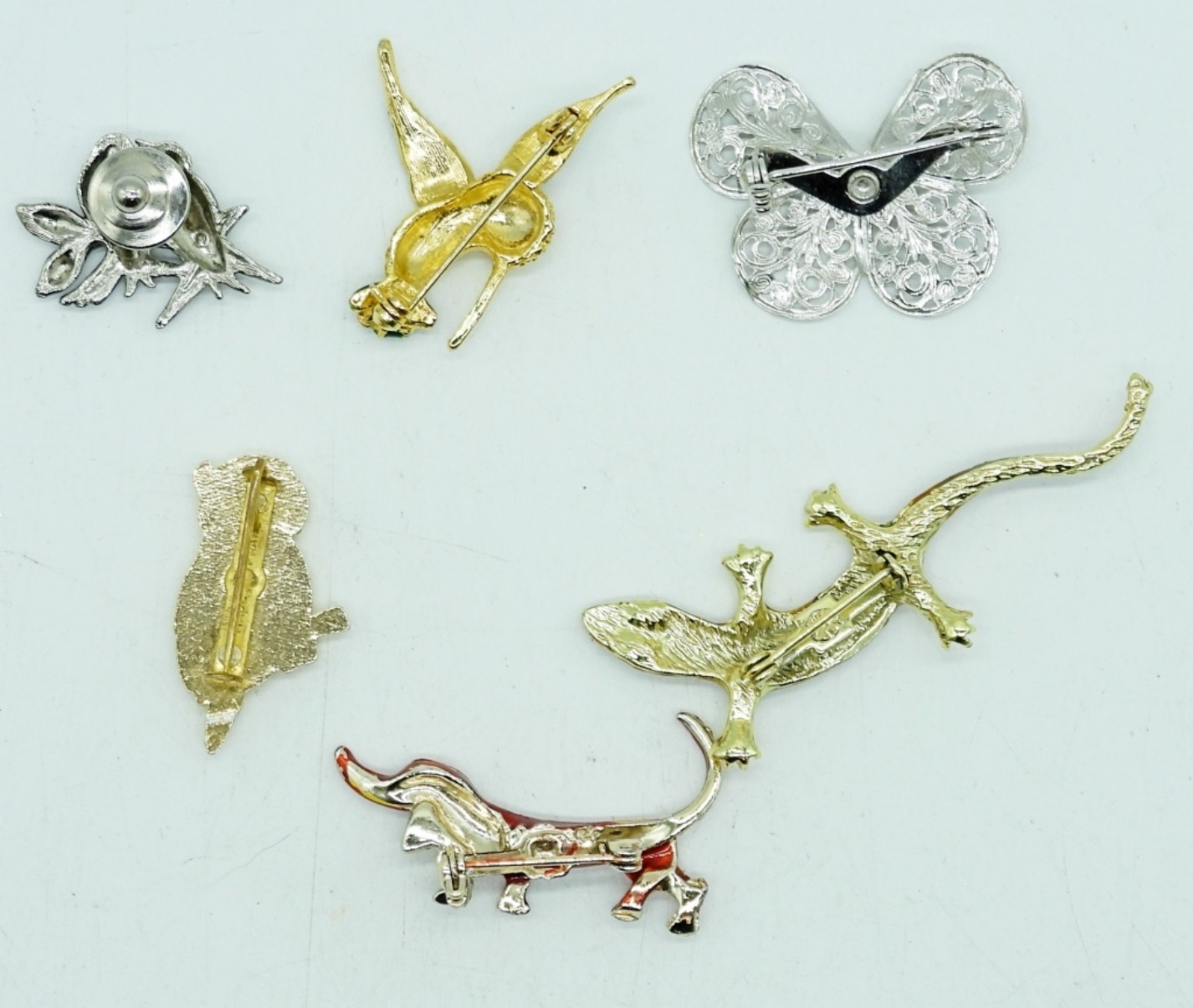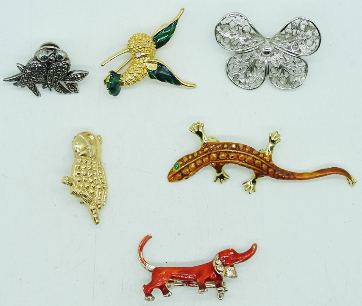 SIX ANIMAL THEMED BROOCHES, GOLD AND SILVER TONES. 1-3″.