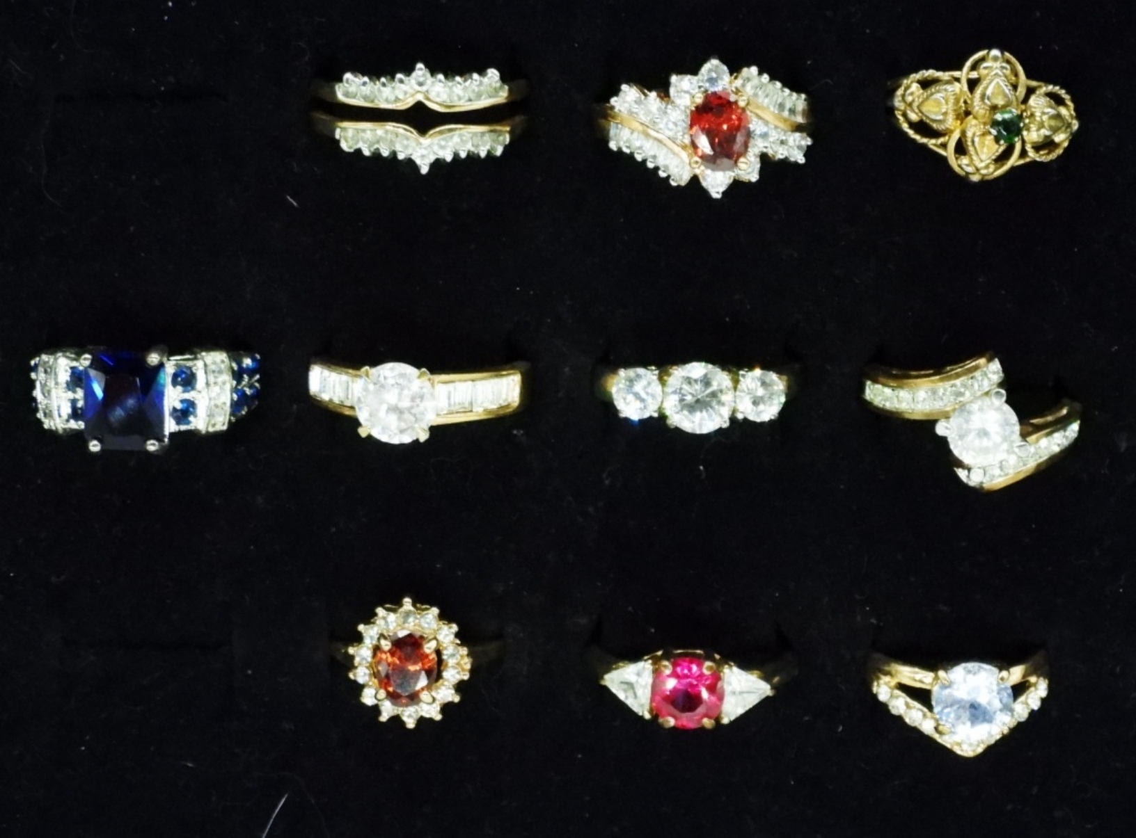 TEN GOLD TONE FASHION RINGS WITH GEMSTONES. SIZES 6-10