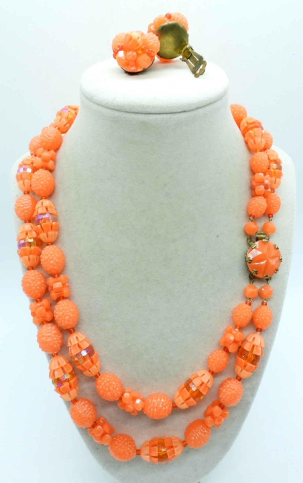 BRIGHT ORANGE DOUBLE STRANDED NECKLACE, PLASTIC BEADS 20″. MATCHING CLIP ON EARRINGS