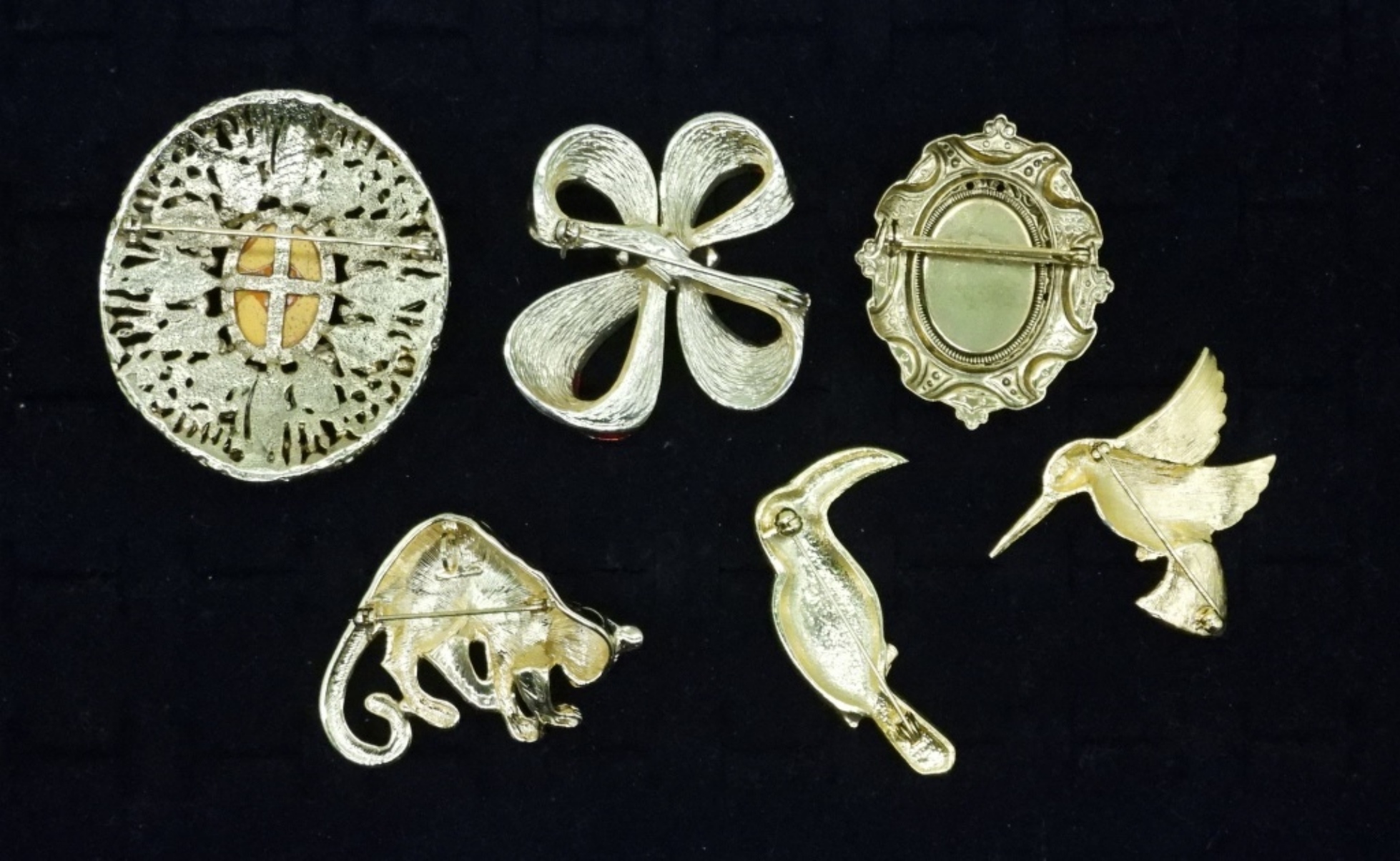 SIX GOLD TONE BROOCHES. 2″-3″.