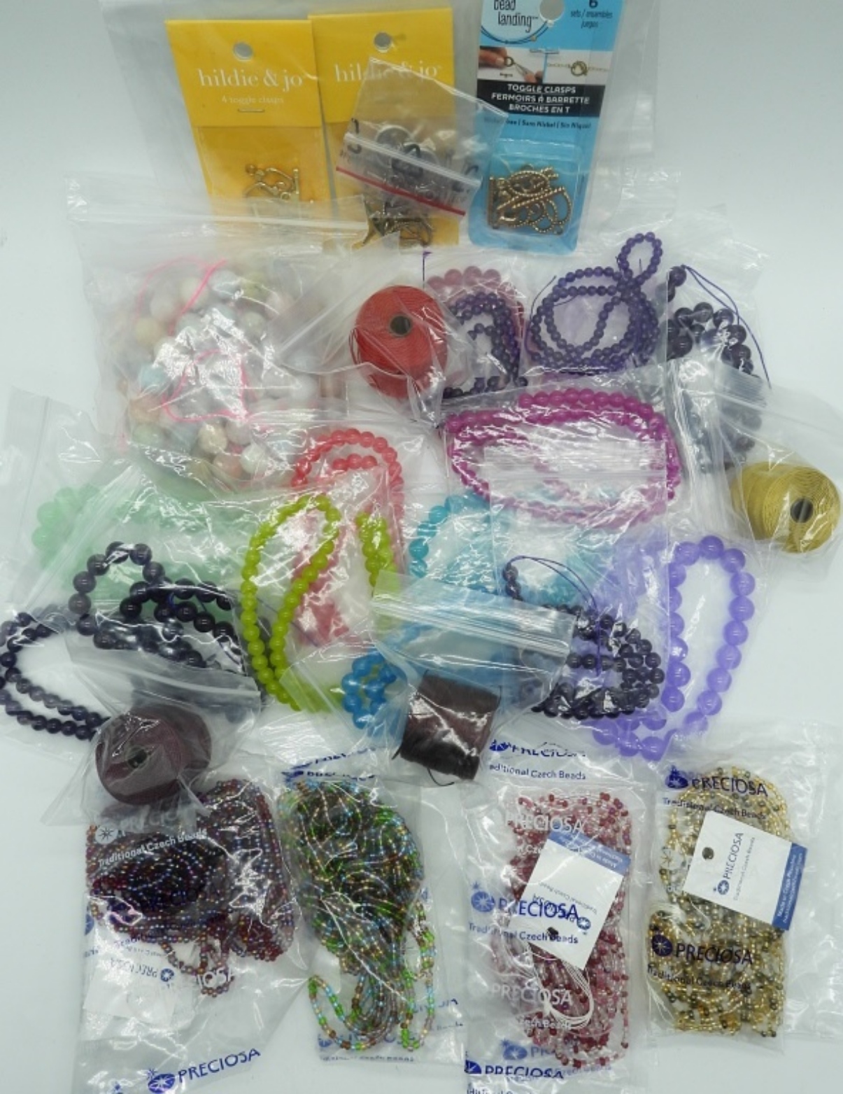 20 BAGS OF BEADS. 4 SPOOLS OF COLORED STRING. 4 PACKAGES OF HARDWARE. SEE PHOTOS