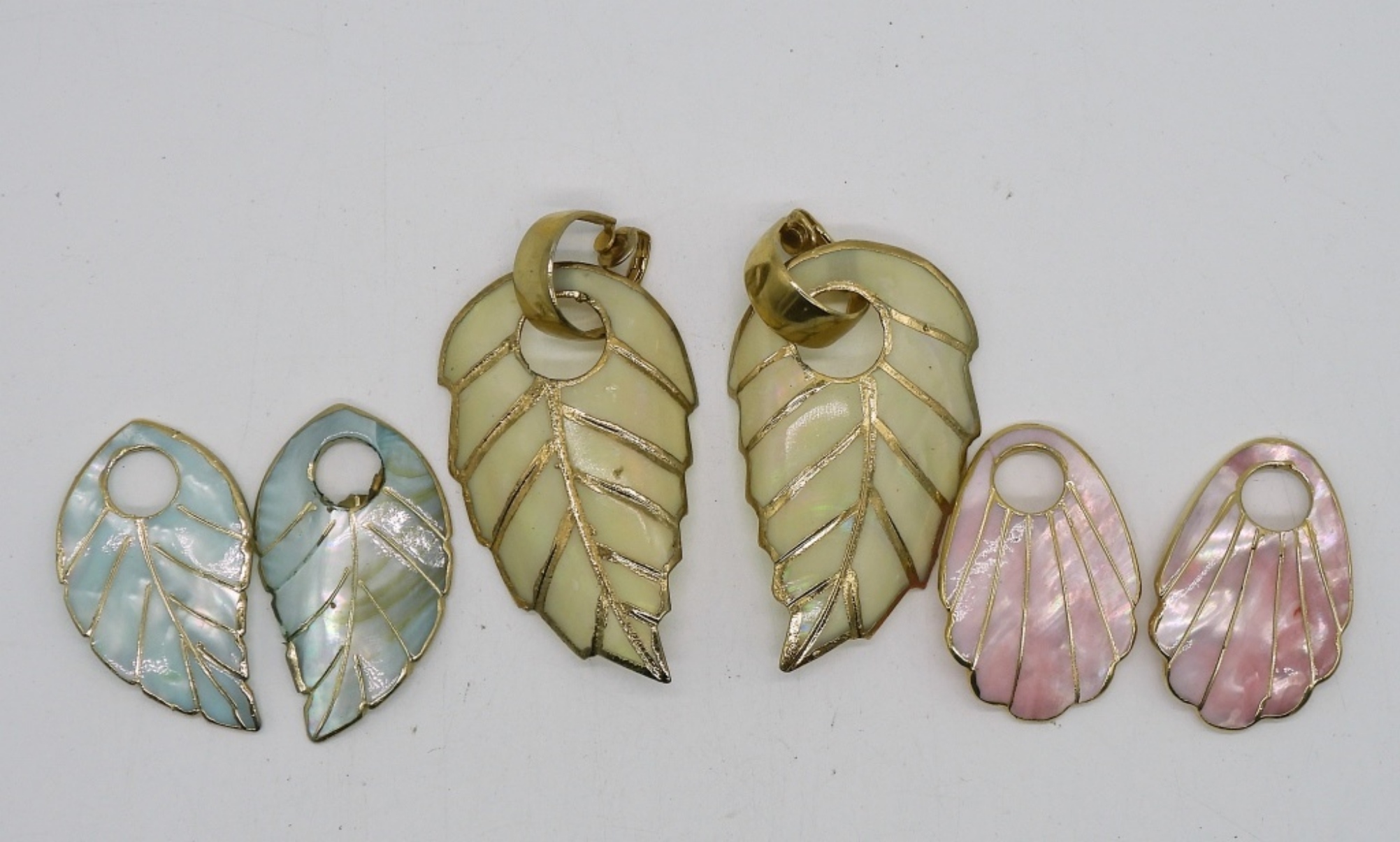ABALONE SHELL CLIP ON EARRINGS WITH EXTRAS TO CHANGE THEM OUT. GOLD TONE AND PAINTED ABALONE SHELL. 1.5″-3″.
