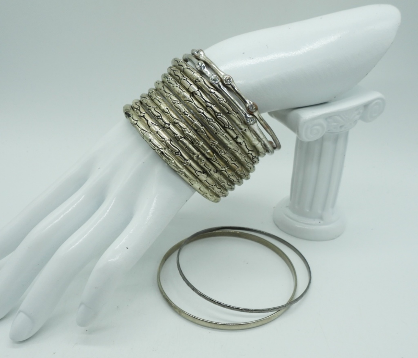 TWELVE SILVER TONE BANGLE BRACELETS. 5-6″.