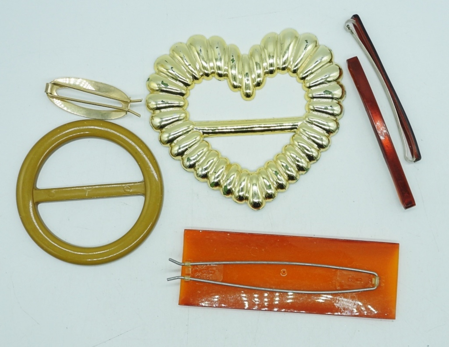 TWO VINTAGE PLASTIC T-SHIRT /SCARF TIES. FOUR VINTAGE HAIR CLIPS.