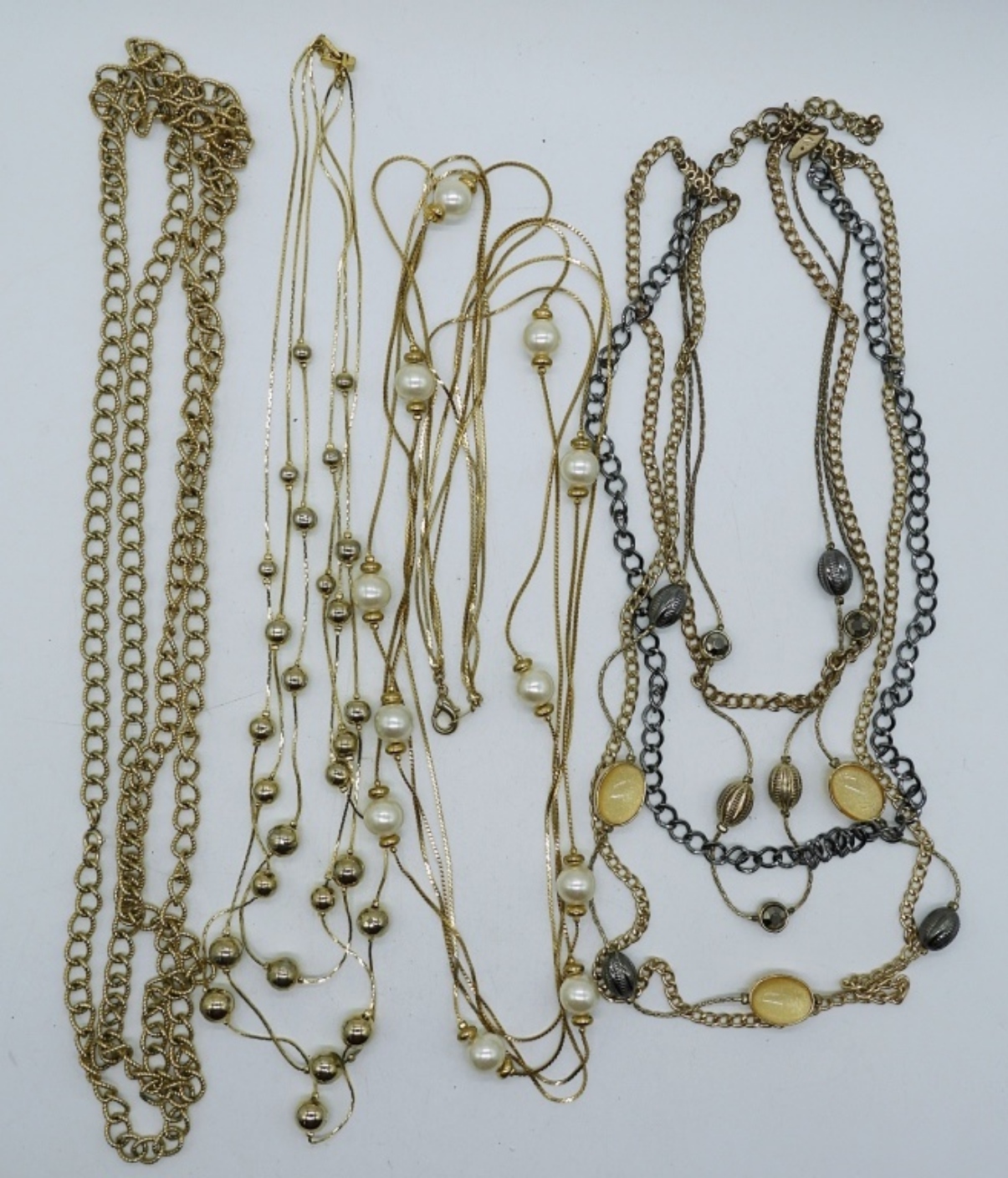 3 GOLD TONE MULTI STRAND NECKLACES, 20″, 24″, 34″. ONE GOLD TONE 60″ CHAIN.