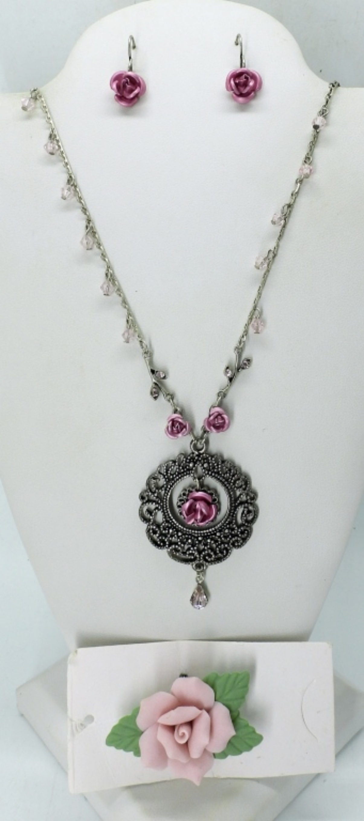 PINK ROSE, SILVER TONE NECKLACE 20″. MATCHING PIERCED EARRINGS. ROSE PIN.