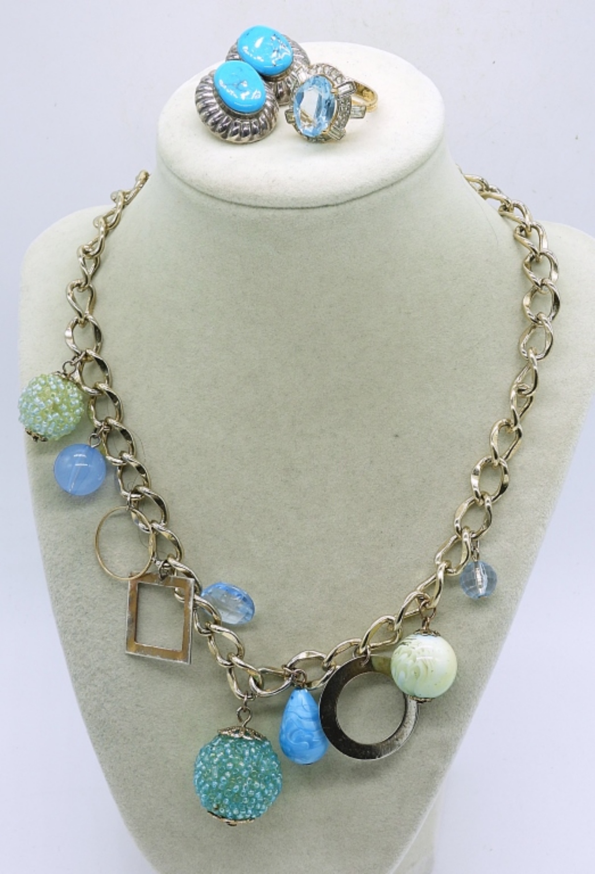 (3) LADIES BLUE AND GOLD TONE JEWELRY SET,18″ GOLD TONE CHAIN WITH BLUE CHARMS, A SIZE 8 GOLD TONE RING WITH A BLUE STONE AND RHINESTONES AND A PAIR OF EARRINGS WITH A TURQUOISE LIKE STONE