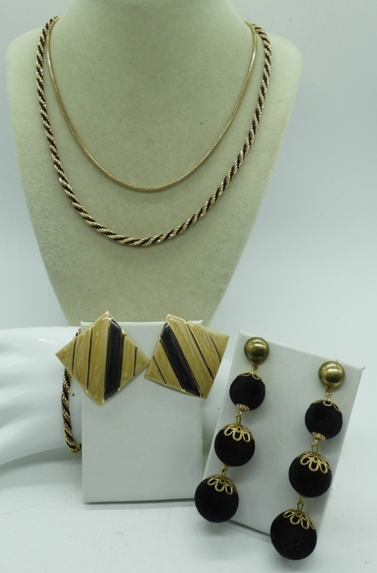 (5) BLACK AND GOLD TONE LADIES SET,18″ GOLD TONE NECKLACE,22″ BLACK & GOLD TONE NECKLACE WITH MATCHING 3″ BRACELET AND 2 PAIR OF EARRINGS