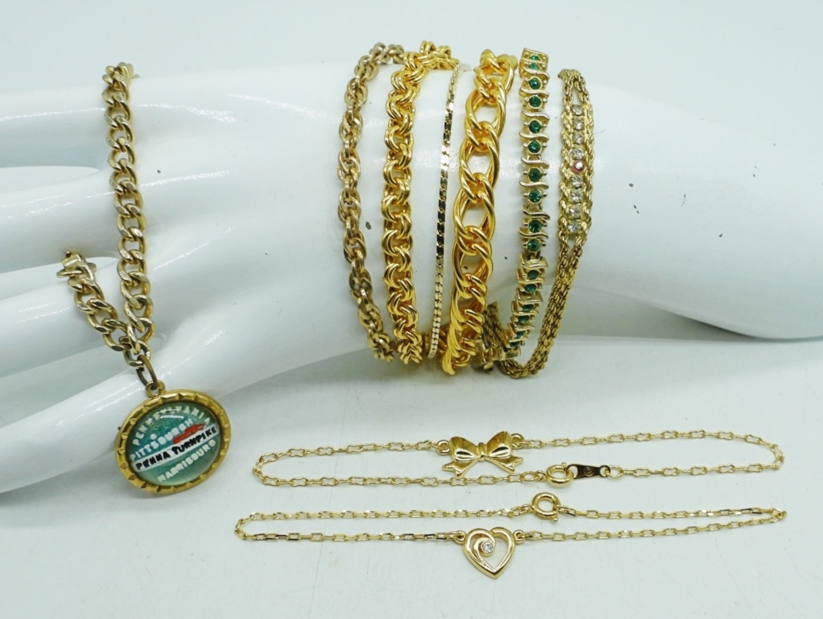NINE GOLD TONE FASHION BRACELETS. 7-8″.
