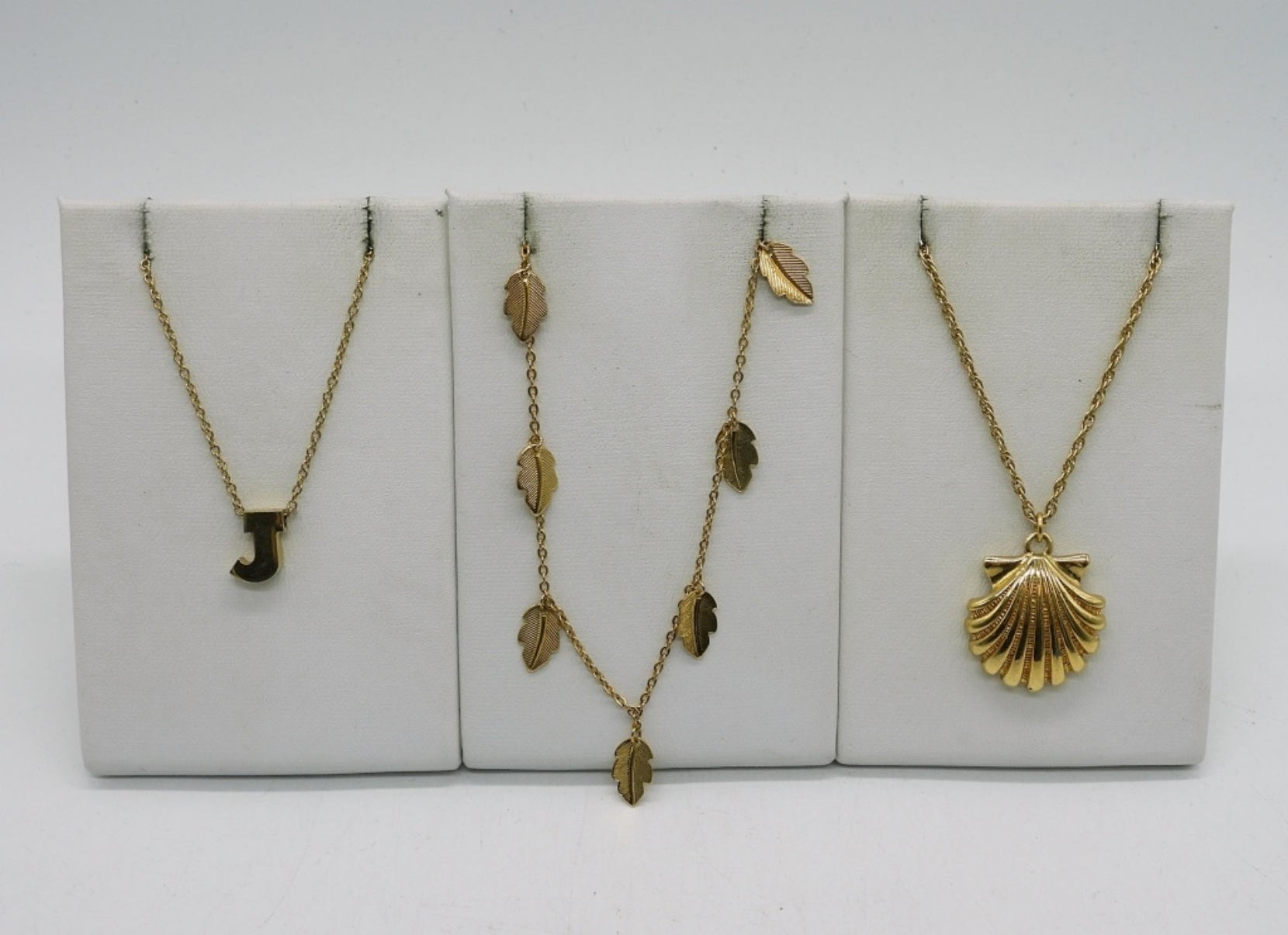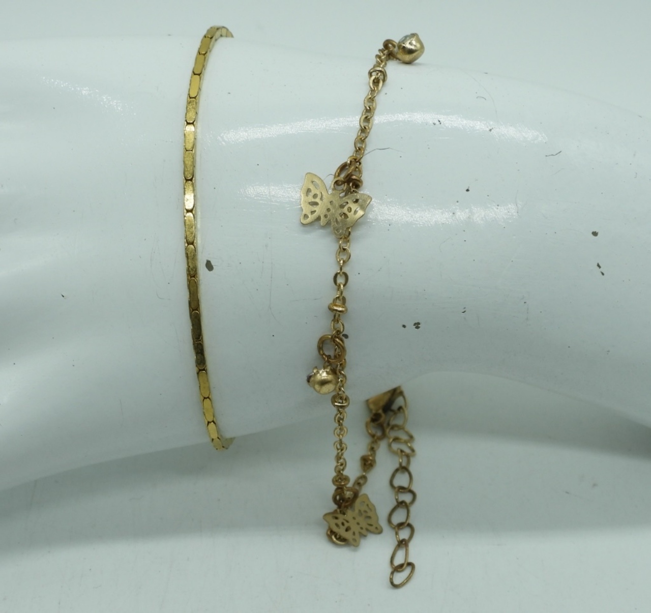 FIVE GOLD TONE NECKLACES, 14″, 16″, 20″. ONE ANKLET & ONE BRACELET, 7″ & 10″.